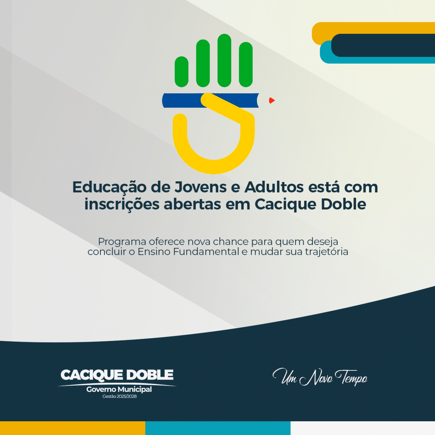 A Secretaria Municipal de Educação de Cacique Doble está com inscrições abertas para a Educação de Jovens e Adultos (EJA), uma oportunidade única para quem tem 15 anos ou mais e ainda não concluiu o Ensino Fundamental. A modalidade é voltada para aqueles que, por algum motivo, interromperam os estudos e agora desejam retomar essa importante etapa da vida.