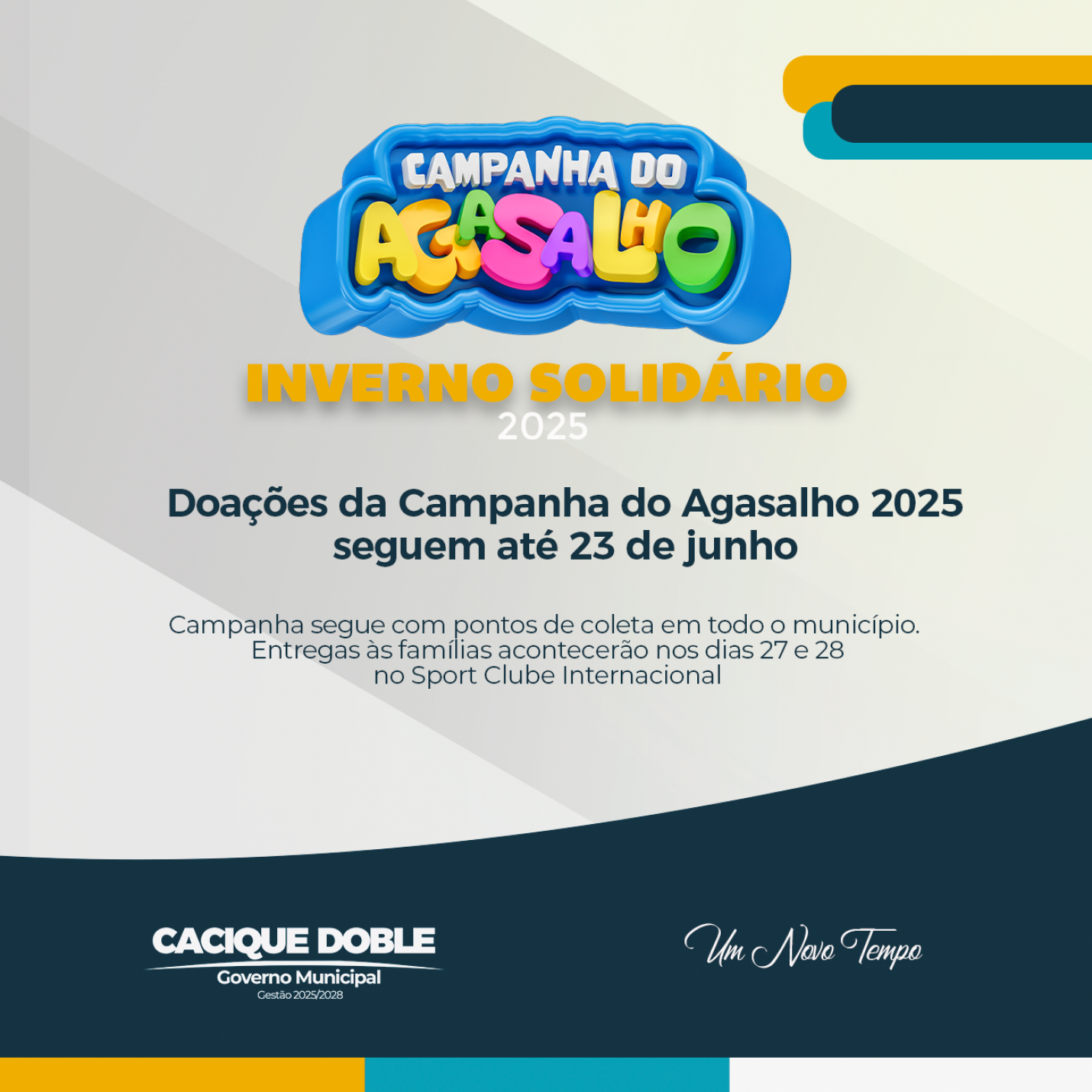 O Governo Municipal de Cacique Doble, por meio da Secretaria de Assistência Social, já está promovendo a Campanha do Agasalho 2025 – Inverno Solidário, que tem como principal objetivo levar mais conforto e calor para as famílias que enfrentam o frio em situação de vulnerabilidade. A ação reforça o espírito de solidariedade e união da comunidade caciquense.