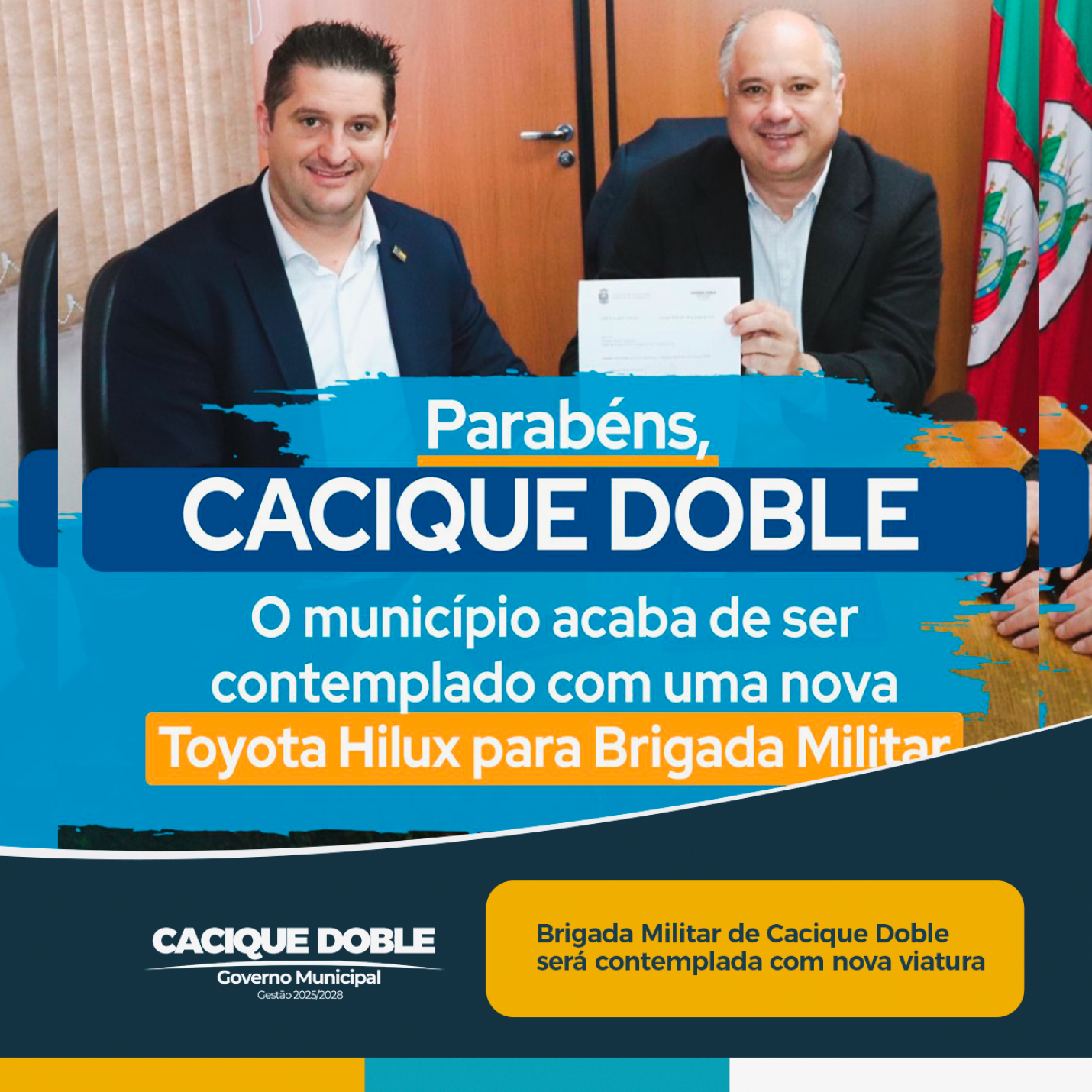 Durante visita ao gabinete do deputado estadual Luciano Silveira, nesta terça-feira, dia 17 de junho, o prefeito de Cacique Doble, Marcio Caprini, recebeu a confirmação de uma importante conquista para a segurança pública do município: Cacique Doble está na lista dos municípios contemplados com uma nova viatura Toyota Hilux para a Brigada Militar.