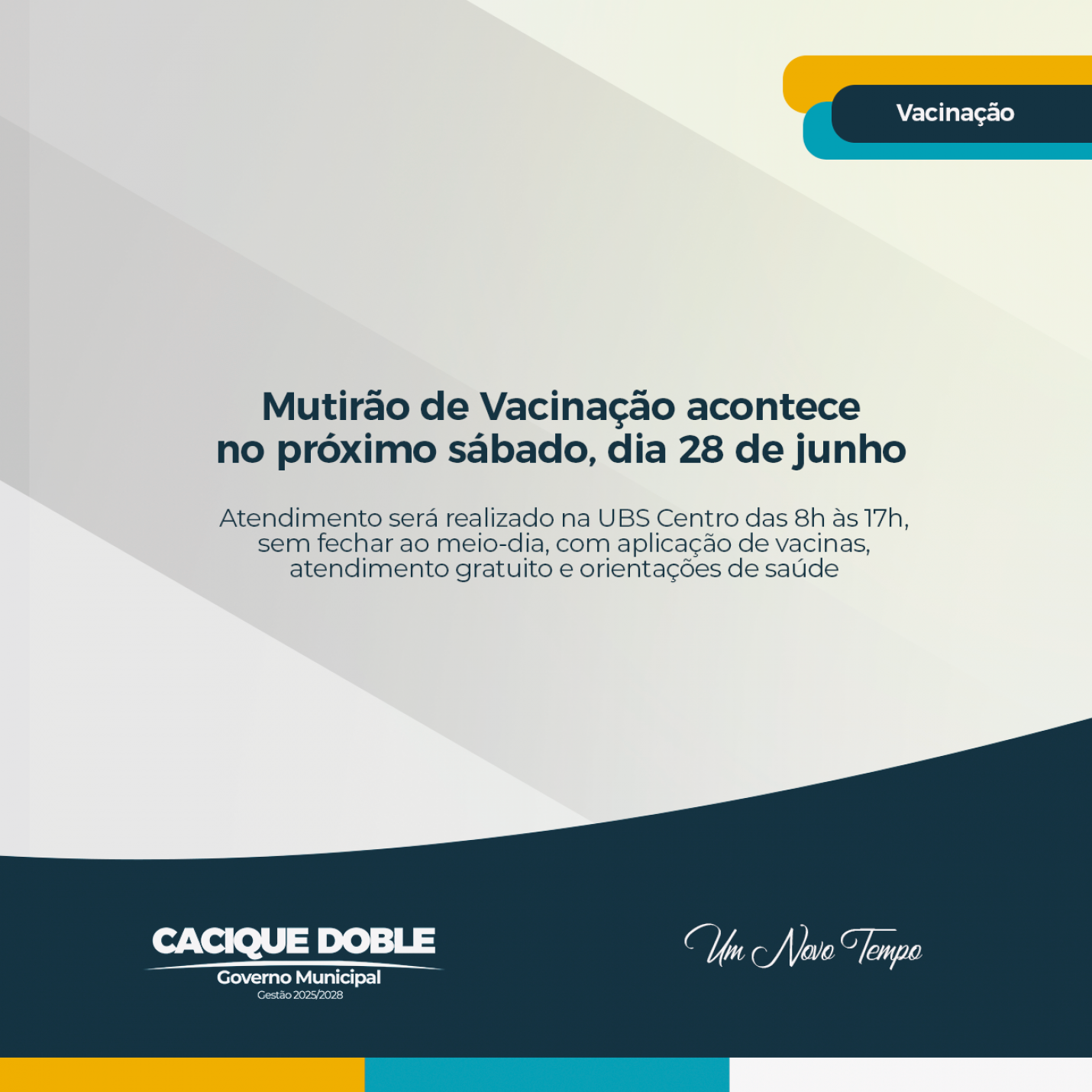 Com foco na atualização das cadernetas de vacinação de crianças, adolescentes, adultos e idosos, a Secretaria Municipal de Saúde de Cacique Doble realiza no próximo sábado, dia 28 de junho, um Mutirão de Vacinação na Unidade Básica de Saúde (UBS) Centro. O atendimento será das 8h às 17h, sem intervalo ao meio-dia, oferecendo mais comodidade para quem deseja colocar a vacinação em dia.