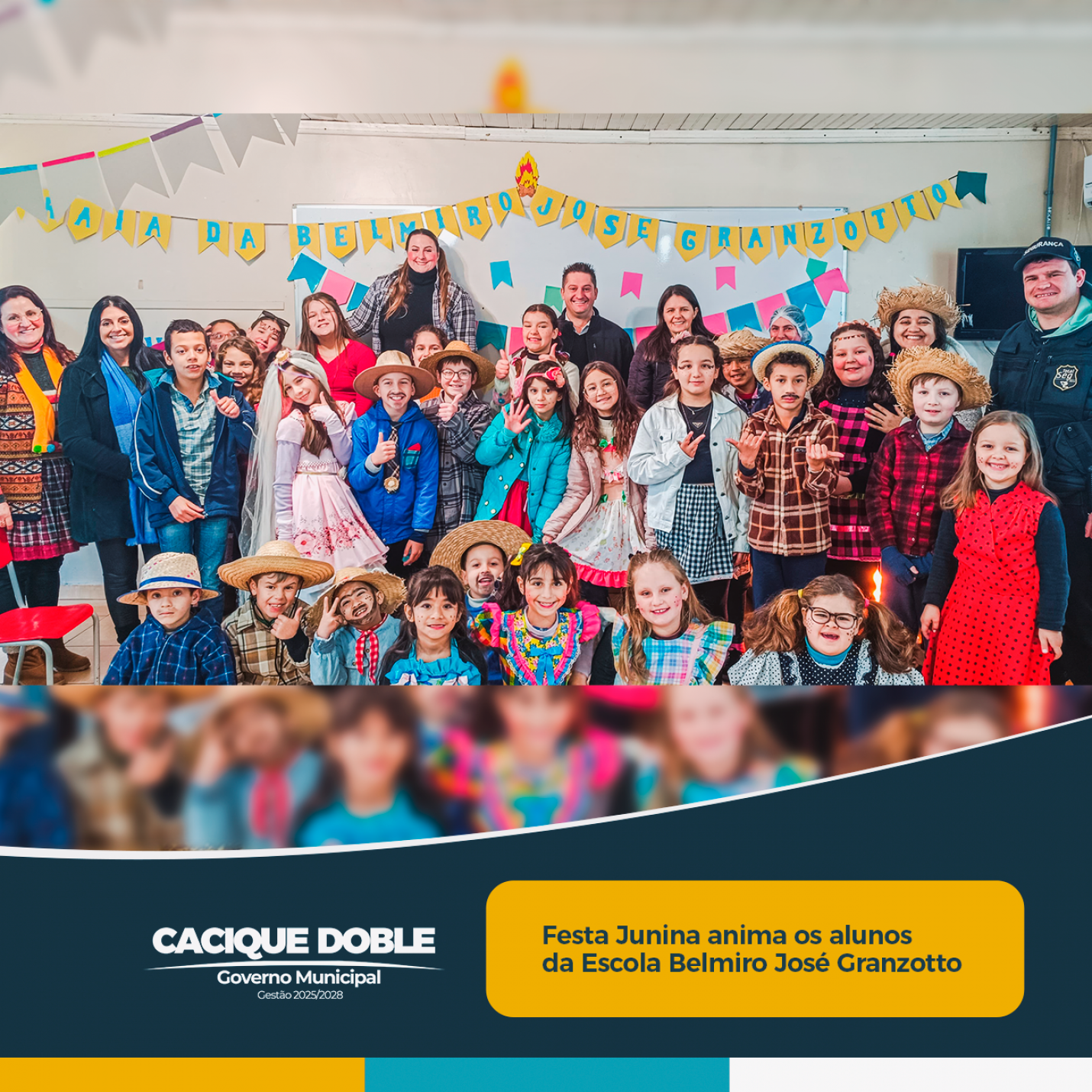 Nem o frio conseguiu tirar o brilho e a animação da Festa Junina da Escola Municipal de Ensino Fundamental Belmiro José Granzotto, realizada nesta terça-feira, 24 de junho. Na data que coincidiu justamente com o dia de São João, a escola se transformou em um verdadeiro arraiá, cheio de cor, alegria e tradição.