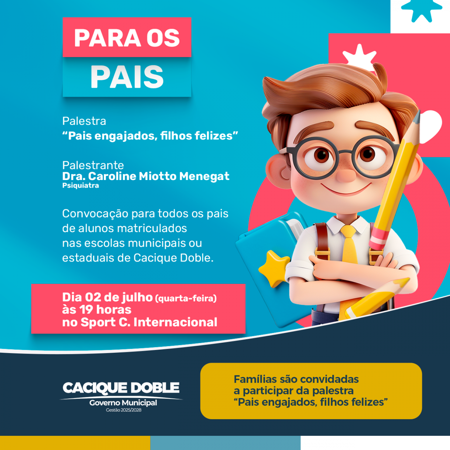 O Governo Municipal de Cacique Doble, por meio da Secretaria Municipal de Educação, convoca todos os pais e responsáveis por alunos das redes municipal e estadual de ensino para participarem de uma importante palestra com a médica psiquiatra Dra. Caroline Miotto Menegat, que acontecerá na terça-feira, dia 02 de julho, às 19h, no Sport Clube Internacional.