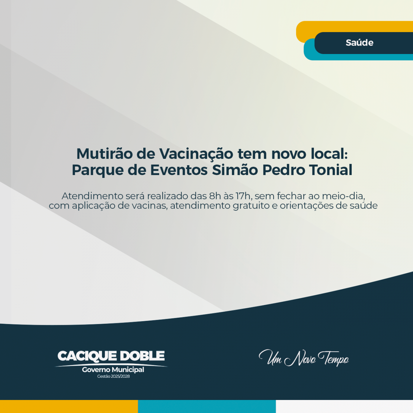 A Secretaria Municipal de Saúde informa que, em razão da previsão de chuva, o Mutirão de Vacinação deste sábado, dia 28 de junho, terá um novo local: o Parque de Eventos Simão Pedro Tonial, proporcionando mais espaço e conforto para os participantes. A ação será realizada das 8h às 17h, sem fechar ao meio-dia, garantindo um dia inteiro de atendimento gratuito e orientações de saúde.