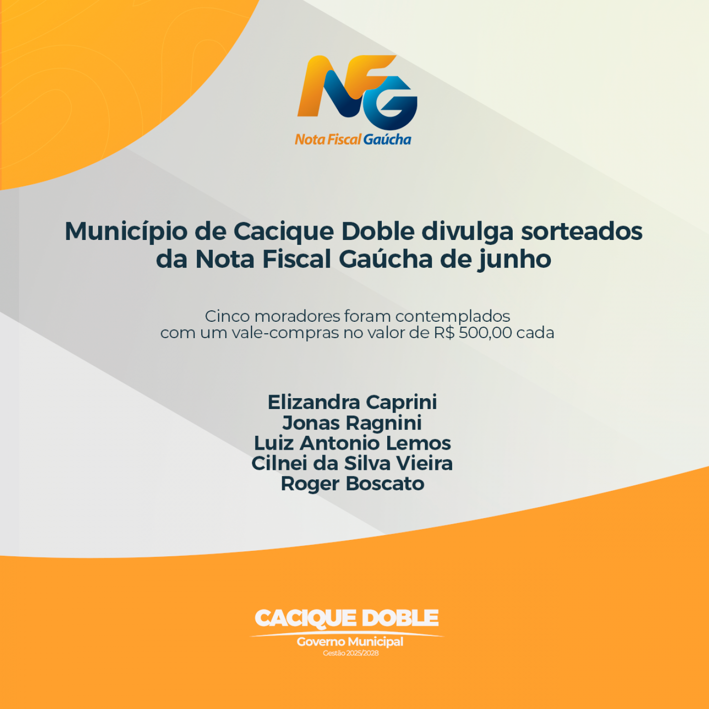 O governo municipal de Cacique Doble divulga os ganhadores do sorteio municipal de junho do Programa Nota Fiscal Gaúcha (NFG). Cinco moradores foram contemplados com um vale-compras no valor de R$ 500,00 cada. Os ganhadores têm um prazo de até 90 dias para realizar o resgate do prêmio.