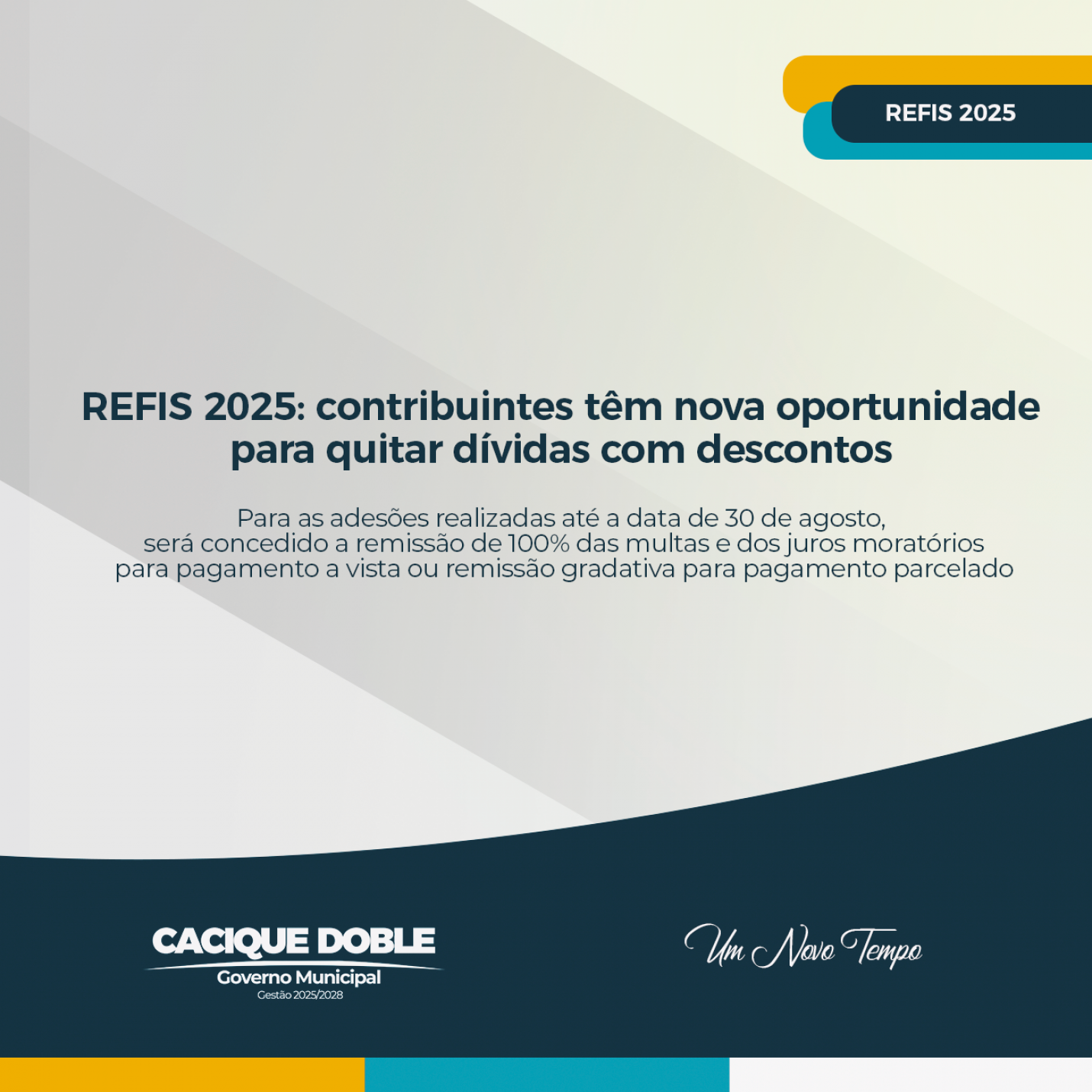 O Governo Municipal de Cacique Doble lançou o Programa de Recuperação Fiscal – REFIS 2025, por meio da Lei Municipal nº 1.718/2025, oferecendo condições especiais para que pessoas físicas e jurídicas regularizem seus débitos com o município. A iniciativa permite a quitação de dívidas vencidas até 31 de dezembro de 2024, incluindo tributos, tarifas, multas, contribuição de melhoria e outros débitos, com expressivos descontos em juros e multas.