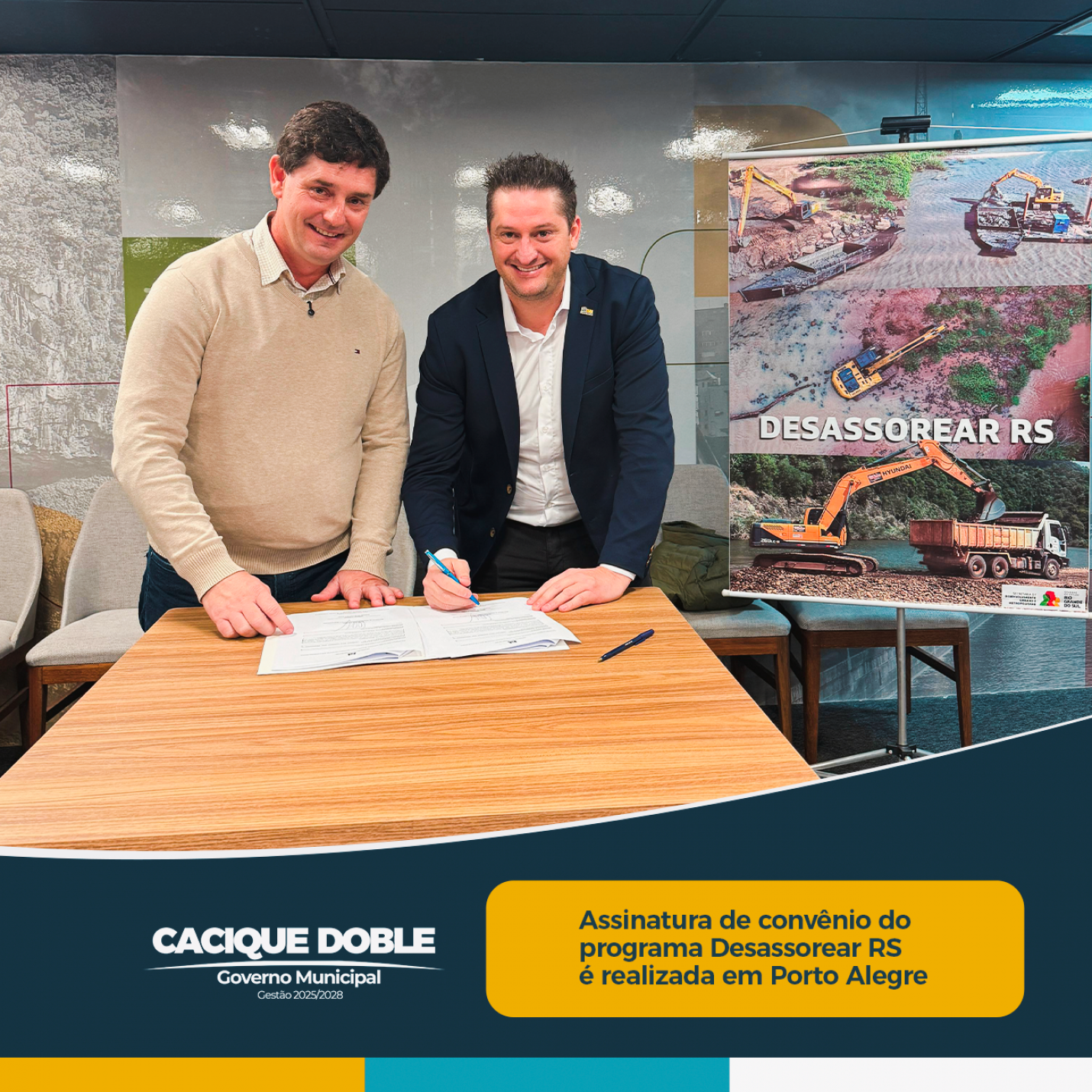 Cacique Doble foi um dos 154 municípios gaúchos contemplados pelo programa Desassorear RS, promovido pela Secretaria de Desenvolvimento Urbano e Metropolitano (Sedur) do Governo do Estado do Rio Grande do Sul. O prefeito Marcio Caprini participou nesta quarta-feira, 9 de julho, em Porto Alegre, da solenidade de assinatura do Termo de Cooperação e da Ordem de Início do programa.