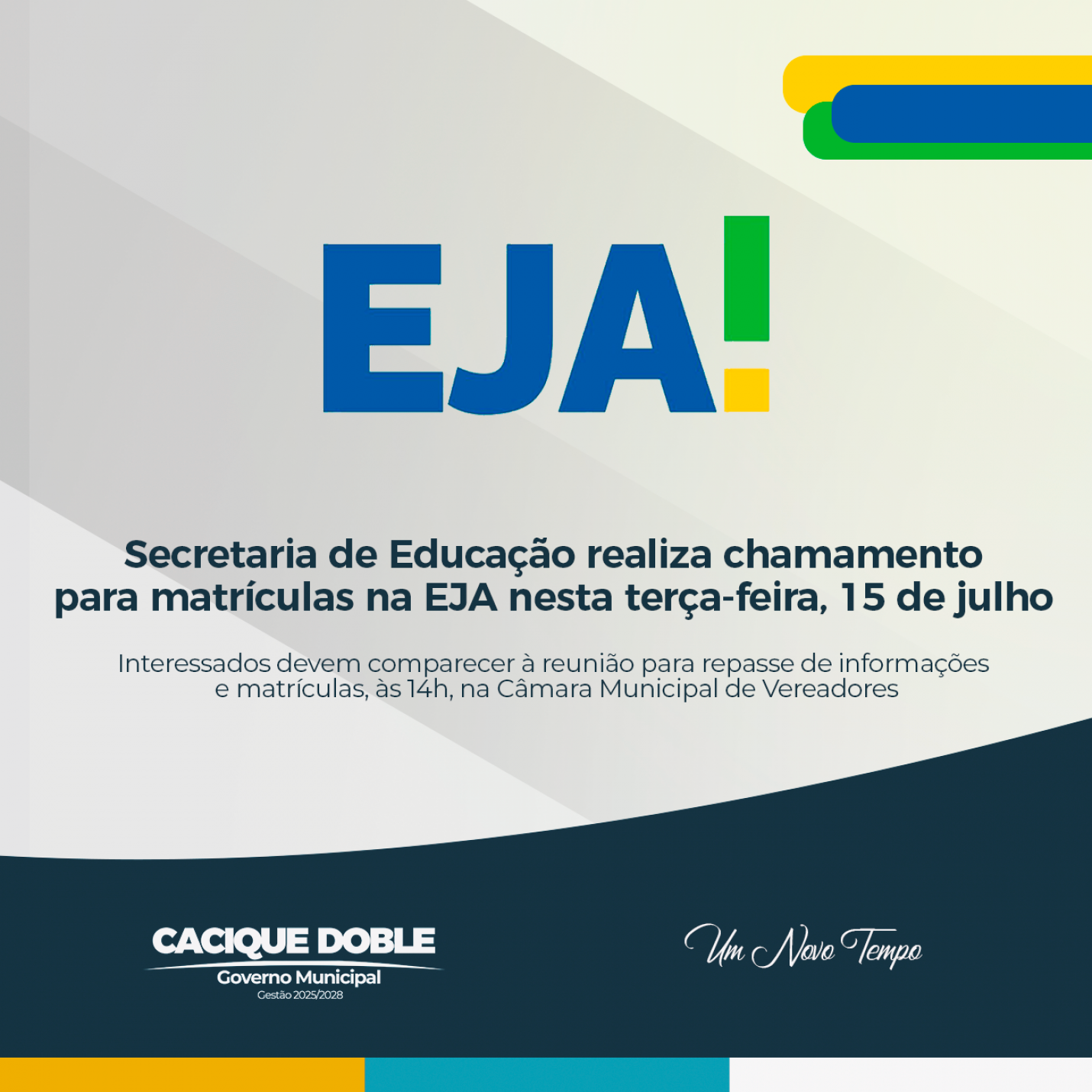 A Secretaria Municipal de Educação de Cacique Doble convida todos os interessados em participar da Educação de Jovens e Adultos (EJA) para comparecerem nesta terça-feira, dia 15 de julho, às 14h, na Câmara Municipal de Vereadores, onde serão realizadas as matrículas e repassadas informações importantes sobre o funcionamento das aulas.