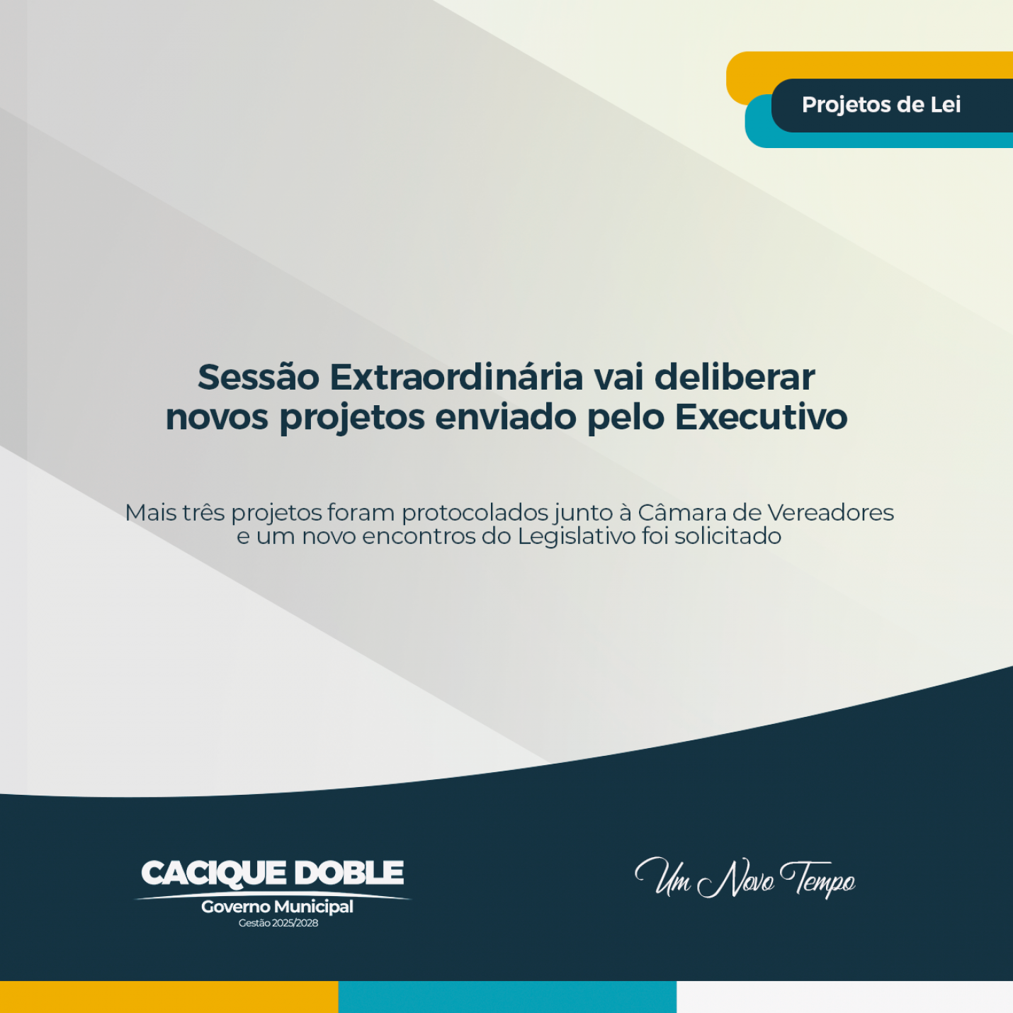 O prefeito Marcio Caprini convocou uma nova Sessão Extraordinária da Câmara Municipal de Vereadores de Cacique Doble, com o objetivo de apreciar e votar mais três projetos que foram protocolados durante o período de recesso legislativo. A deliberação será realizada nesta quarta-feira, dia 16 de julho, às 19h.