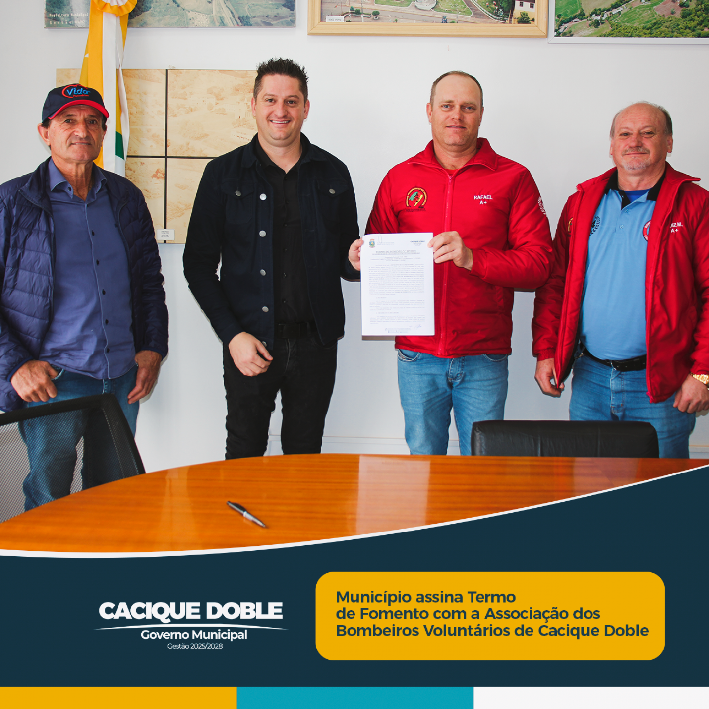 Com o objetivo de garantir recursos financeiros para fortalecer as atividades da corporação, que atua de forma 100% voluntária e representa um importante serviço de apoio à comunidade, na manhã desta quarta-feira, 16 de julho, foi oficializada a assinatura do Termo de Fomento Nº 009/2025 entre o município de Cacique Doble e a Associação Corpo de Bombeiros Voluntários de Cacique Doble. O ato ocorreu no gabinete e contou com a presença do prefeito Marcio Caprini, do vice-prefeito Alceu Demartini, do presidente da Associação, Rafael Mezzalira, e do vice-presidente, Inácio Rosin.
