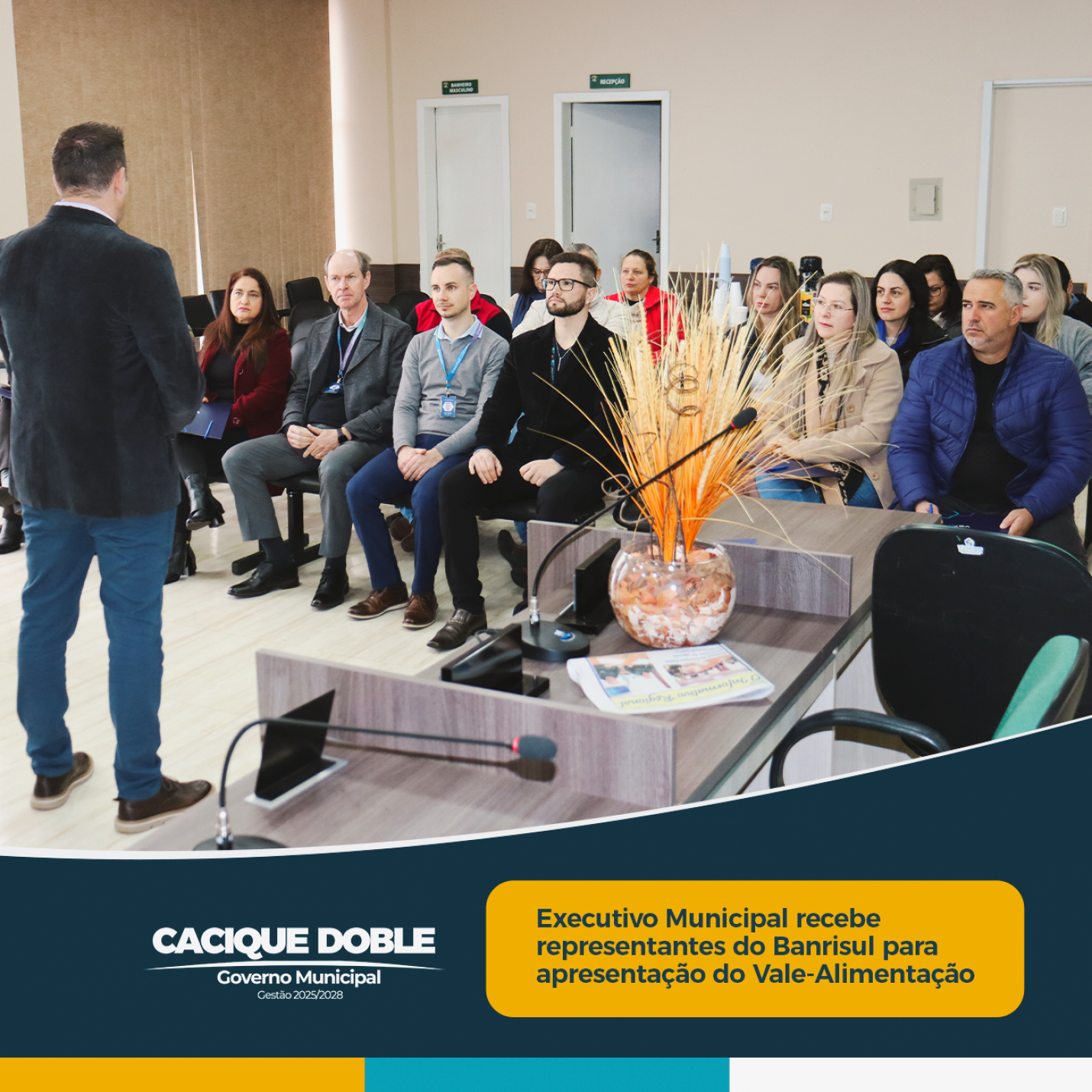 O funcionalismo público de Cacique Doble terá uma nova funcionalidade: o Vale-Alimentação por meio de cartão magnético. Na manhã desta sexta-feira, dia 18 de julho, o Governo Municipal de Cacique Doble recebeu representantes do Banrisul para uma apresentação institucional sobre o funcionamento e benefícios do vale-alimentação, que será fornecido por meio da instituição bancária.