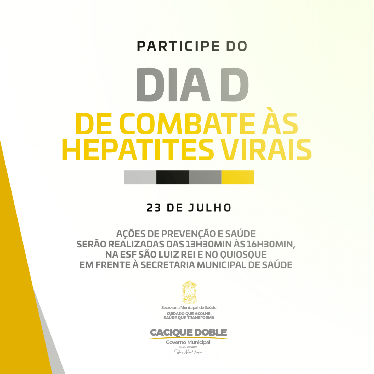 A Secretaria Municipal de Saúde de Cacique Doble realiza, na próxima quarta-feira, dia 23 de julho, o Dia D de combate às Hepatites Virais, com ações voltadas à conscientização, prevenção e diagnóstico precoce dessas doenças silenciosas, mas que podem causar sérias complicações se não forem tratadas adequadamente.