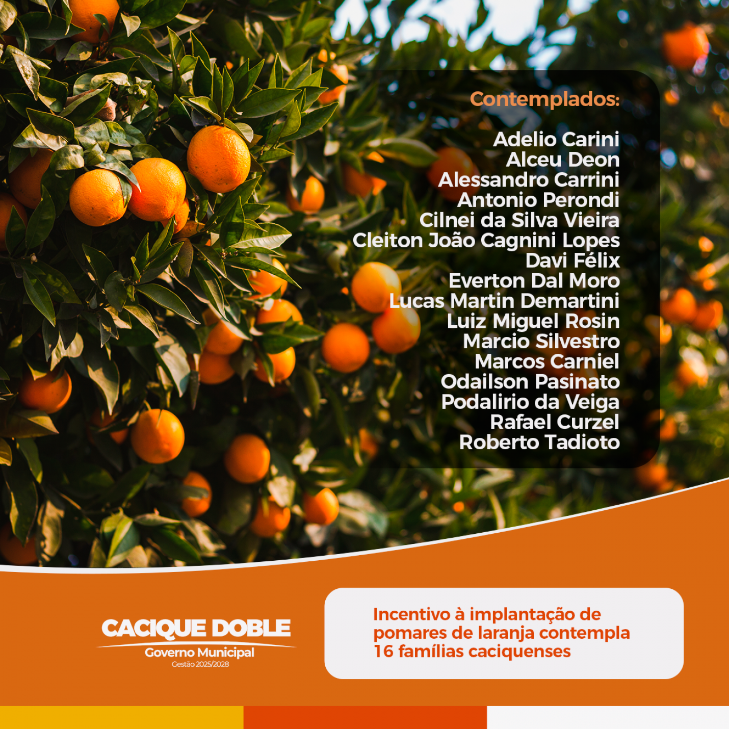 O Governo Municipal de Cacique Doble, por meio da Secretaria de Agricultura, divulga a relação final dos contemplados no Programa de Incentivo à Fruticultura. Ao todo, 16 produtores rurais foram selecionados para receber o subsídio destinado à implantação de pomares de laranja, com auxílio de até R$ 3.300,00 por família, totalizando R$ 52.800,00 em investimentos municipais.