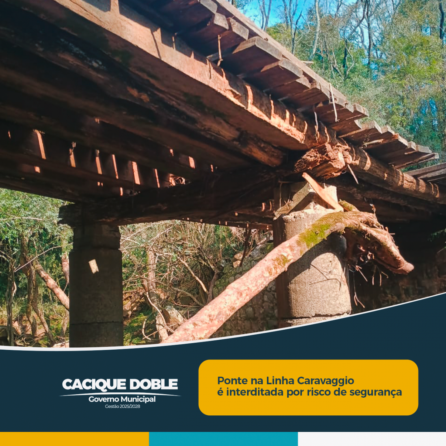 As prefeituras de Cacique Doble e Santo Expedito do Sul comunicam à população que a ponte localizada na Linha Caravaggio, nas proximidades das propriedades de Eurico de Mattos e Antônio Zucco, está interditada a partir desta quarta-feira, dia 23 de julho. A decisão foi tomada em conjunto pelas duas administrações municipais após vistoria realizada pelo vice-prefeito de Santo Expedito do Sul Jair Mendes da Silva, e pelo vice-prefeito de Cacique Doble Alceu Demartini, que constataram riscos significativos para o trânsito no local.