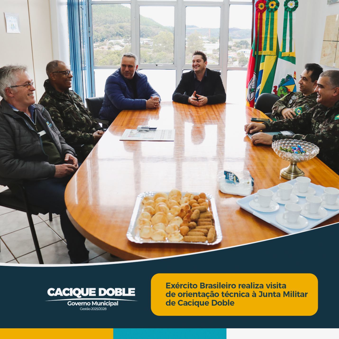 O prefeito de Cacique Doble, Marcio Caprini, que também é presidente da Junta Militar do município, recebeu na tarde desta segunda-feira, 4 de agosto, a visita de orientação técnica do Exército Brasileiro, realizada pelo comando do Posto de Recrutamento e Mobilização (PRM) de Porto Alegre. A comitiva foi composta pelo chefe do PRM 03/001, Tenente-Coronel Luciano Mascena da Cruz Rocha, pelo Oficial Mobilizado Capitão Valdonier Damasceno dos Santos e pelo Delegado do Serviço Militar, 1º Tenente Leovigildo de Paula Neto.