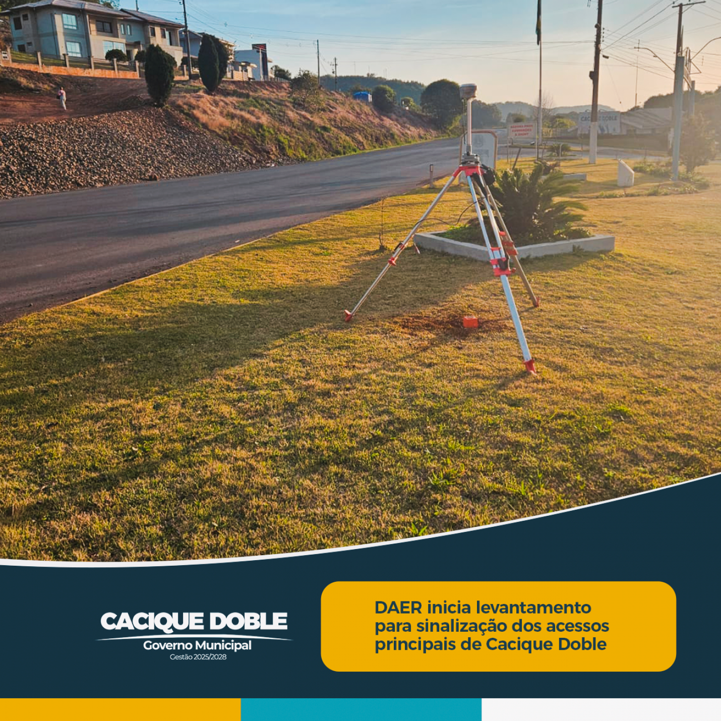 Equipes de topografia do Departamento Autônomo de Estradas de Rodagem (DAER) estiveram em Cacique Doble no último sábado, 2 de agosto, para realizar o primeiro levantamento técnico com vistas à implantação da sinalização vertical e horizontal nos dois principais trevos de acesso ao município. O prefeito Marcio Caprini acompanhou de perto os trabalhos, que marcam o início de uma importante etapa para a melhoria da segurança viária local.