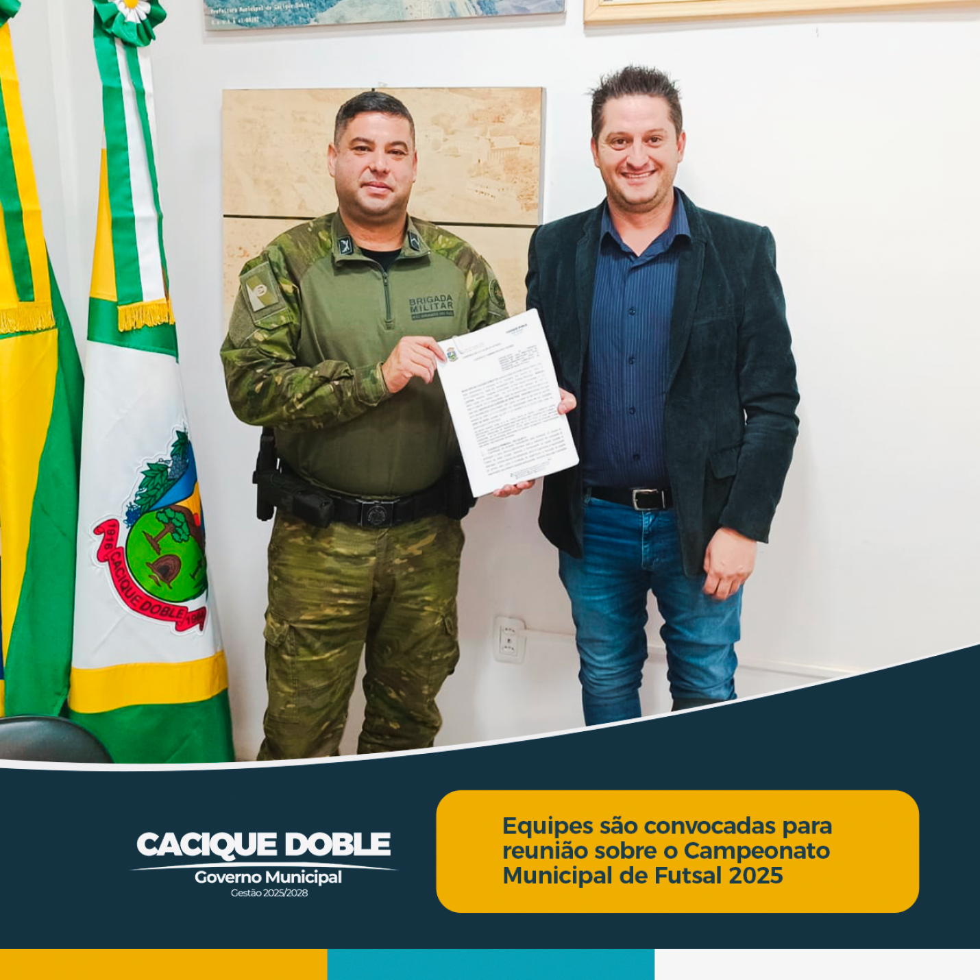 O esporte em Cacique Doble já começa a ganhar clima de competição. O Governo Municipal, por meio da Secretaria de Educação, Desporto e Cultura, convida todas as comunidades e equipes interessadas em participar do Campeonato Municipal de Futsal 2025 para uma reunião decisiva, que será realizada na quinta-feira, 7 de agosto, às 18h30, na Câmara de Vereadores.