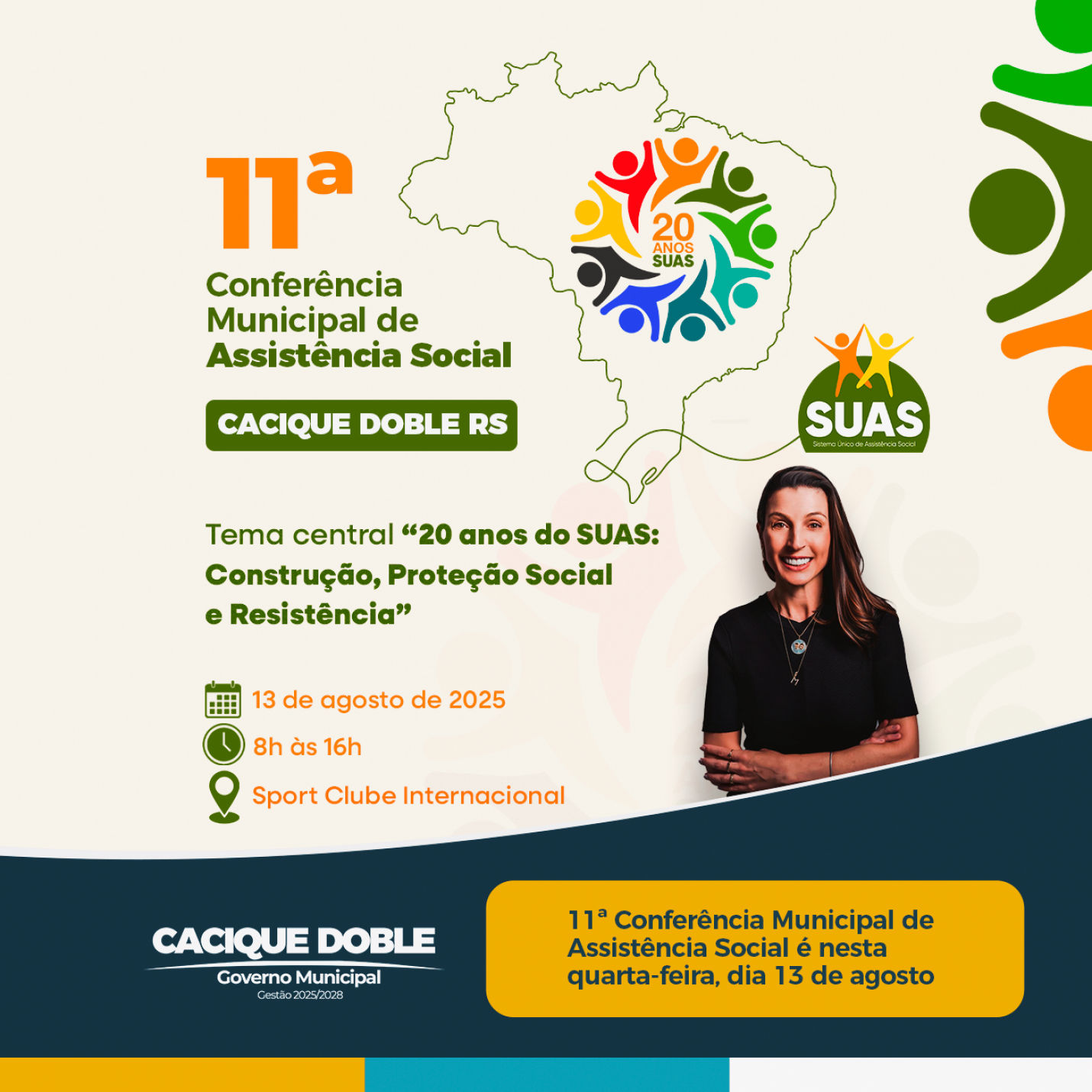 Nesta quarta-feira, dia 13 de agosto, Cacique Doble viverá um dia dedicado ao diálogo, à escuta e à construção coletiva durante a 11ª Conferência Municipal de Assistência Social, no Sport Club Internacional, das 8h às 16h. O encontro é promovido pelo Governo Municipal, por meio da Secretaria de Assistência Social e do Conselho Municipal de Assistência Social (CMAS).
