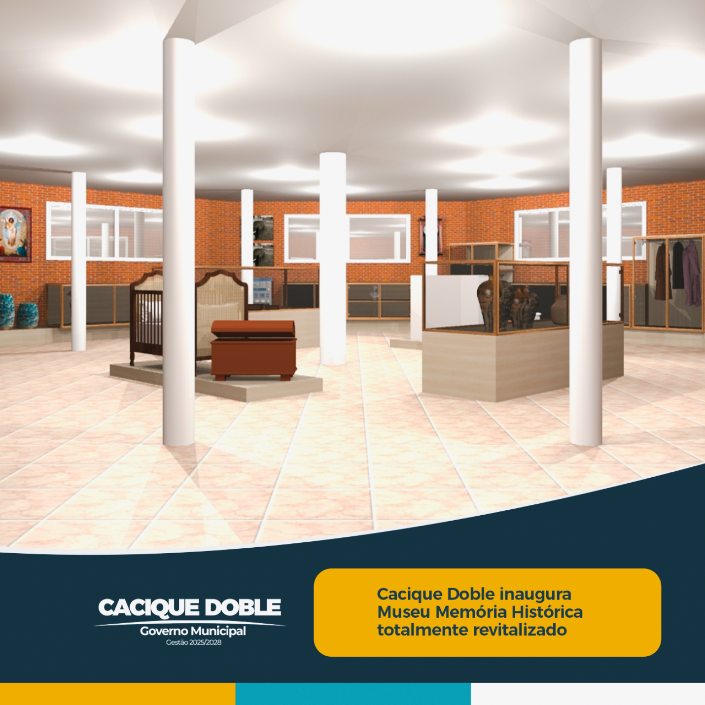 O Museu Memória Histórica de Cacique Doble, guardião da história, memória e identidade cultural do povo caciquense, será reinaugurado no sábado, dia 16 de agosto, às 14h, em solenidade que abre oficialmente as atividades do Dia Estadual do Patrimônio. Localizado ao lado do Ginásio Municipal, o espaço passou por uma ampla reforma e reorganização, ganhando melhorias estruturais e um novo projeto de mobiliário pensado para valorizar ainda mais o acervo.
