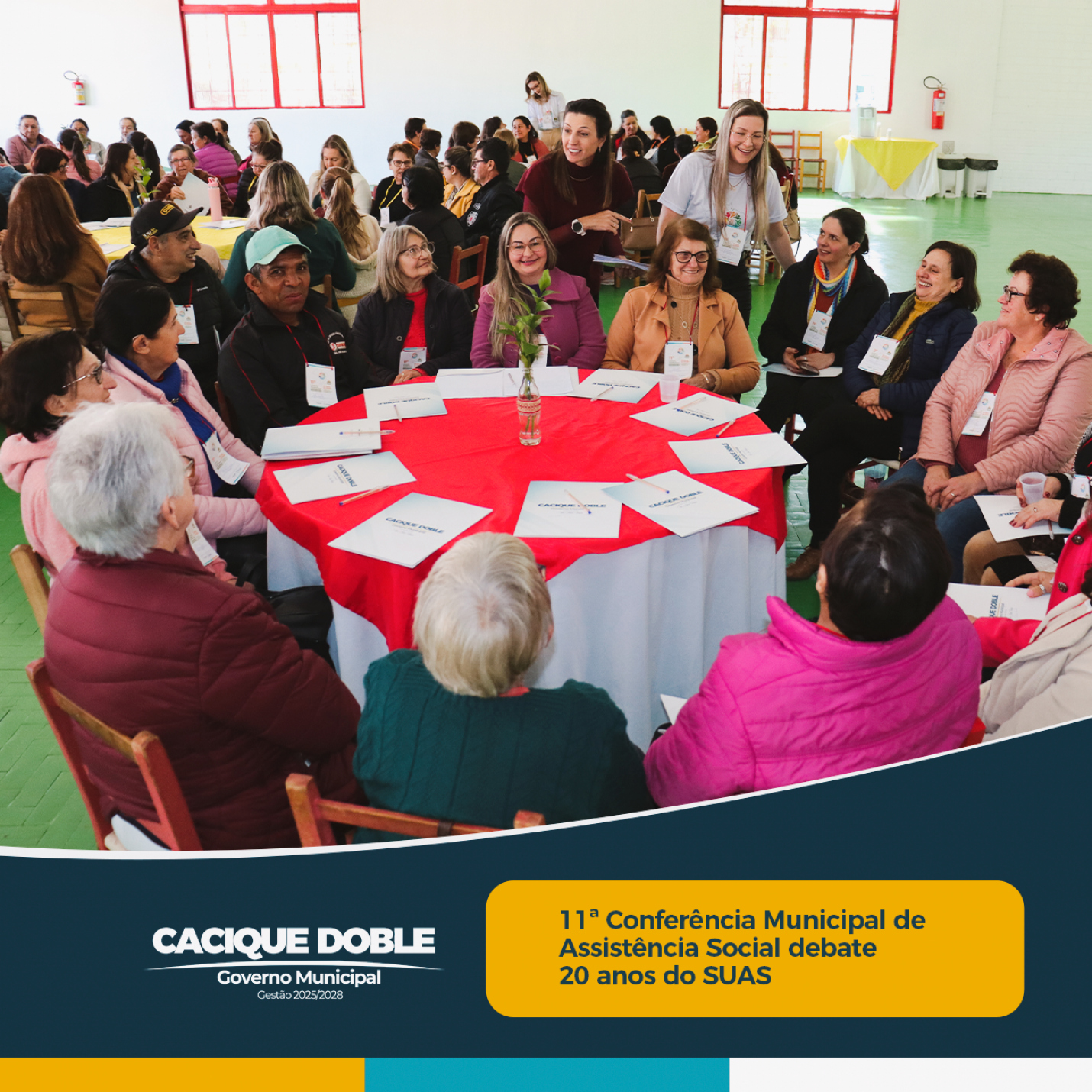 Com um olhar atento ao presente e ao futuro da política de assistência social, Cacique Doble promoveu, nesta quarta-feira, dia 13 de agosto, a 11ª Conferência Municipal de Assistência Social, que trouxe para debate o tema “20 anos do SUAS: construção, proteção social e resistência”. Realizado no Sport Clube Internacional, o encontro reuniu autoridades, trabalhadores da rede socioassistencial, representantes da sociedade civil e usuários dos serviços para um momento de escuta, diálogo e construção coletiva de propostas.