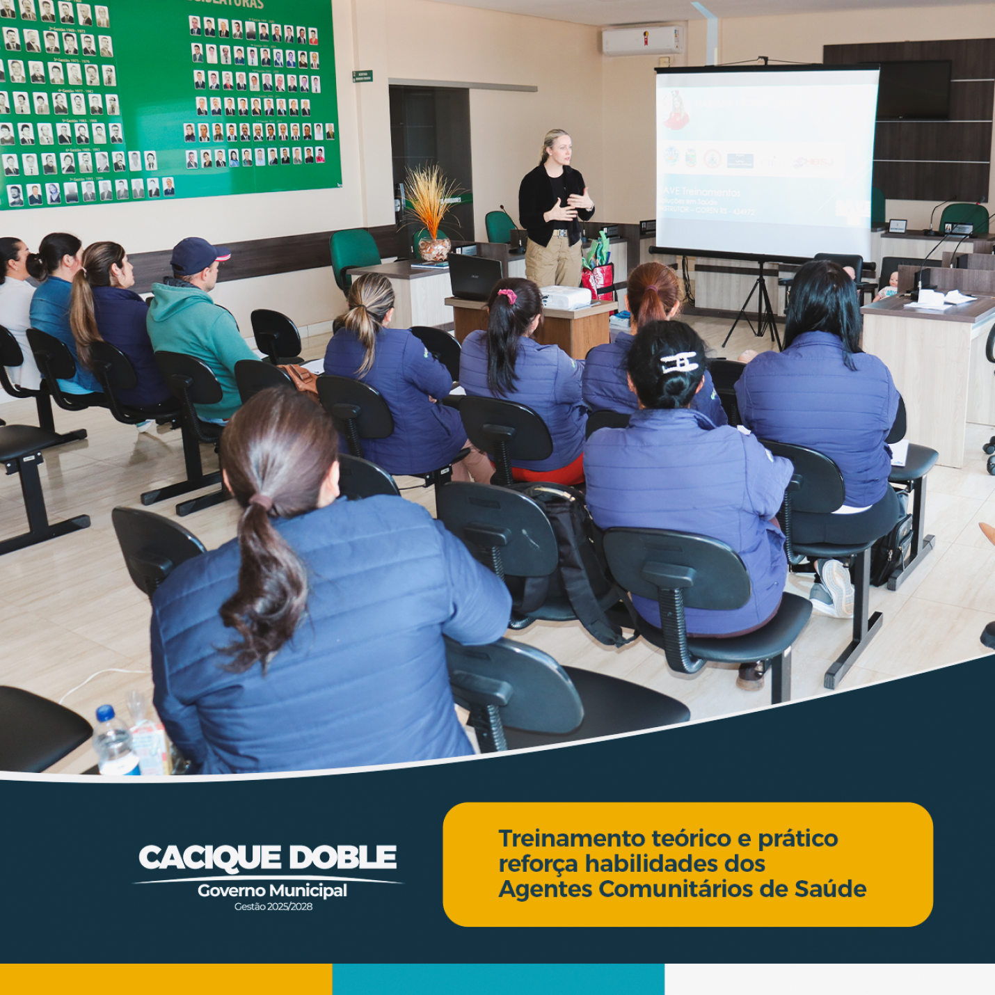 Com o objetivo de ampliar o conhecimento e as habilidades dos profissionais, na tarde desta quinta-feira, 14 de agosto, a Secretaria Municipal de Saúde promoveu uma capacitação em primeiros socorros para os Agentes Comunitários de Saúde (ACS) de Cacique Doble. O treinamento foi ministrado pela enfermeira Mariana Luchese Vasen, da empresa Save Treinamento, e teve cerca de três horas de duração, combinando conteúdo teórico e atividades práticas.