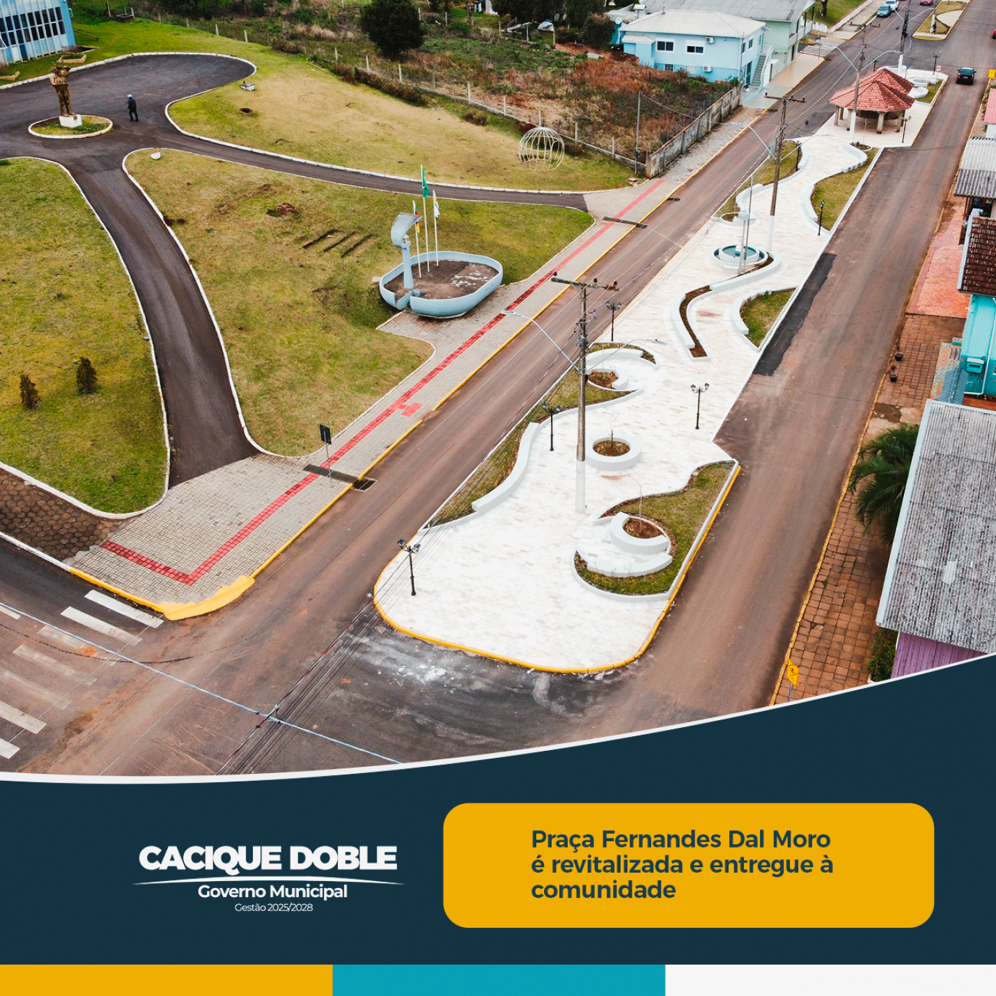 O Governo Municipal de Cacique Doble concluiu as obras de reforma e revitalização da Praça Fernandes Dal Moro – Calçadão da Avenida Kaingang, transformando o espaço em um ambiente moderno, funcional e acolhedor para a comunidade. O projeto, iniciado em dezembro de 2024, foi concluído no final de julho de 2025 e contou com investimento total de R$ 243.739,95 sendo R$ 200 mil em emenda parlamentar destinada pela deputada Maria do Rosário e mais R$ 43 mil em contrapartida do município, investidos com recursos próprios.