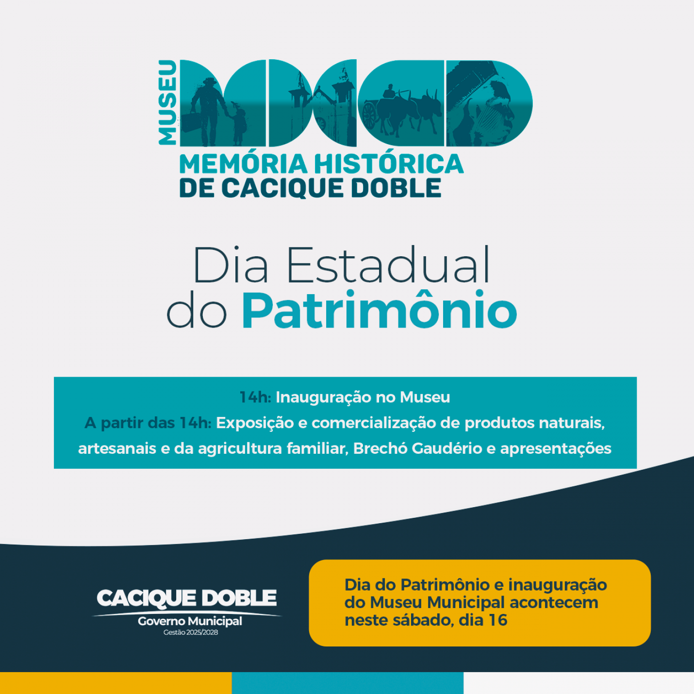 Neste sábado, 16 de agosto, Cacique Doble viverá um momento especial de valorização da história e da cultura local. A partir das 14h, no Ginásio Municipal de Esportes, acontece a programação do Dia Estadual do Patrimônio, que contará com a inauguração do Museu Memória Histórica, localizado ao lado do ginásio.