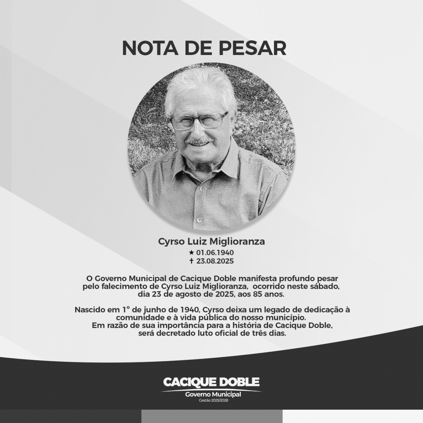 O Governo Municipal de Cacique Doble manifesta profundo pesar pelo falecimento de Cyrso Luiz Miglioranza, ocorrido neste sábado, dia 23 de agosto de 2025, aos 85 anos. Nascido em 1º de junho de 1940, Cyrso deixa um legado de dedicação à comunidade e à vida pública do nosso município. Em razão de sua importância para a história de Cacique Doble, será decretado luto oficial de três dias.