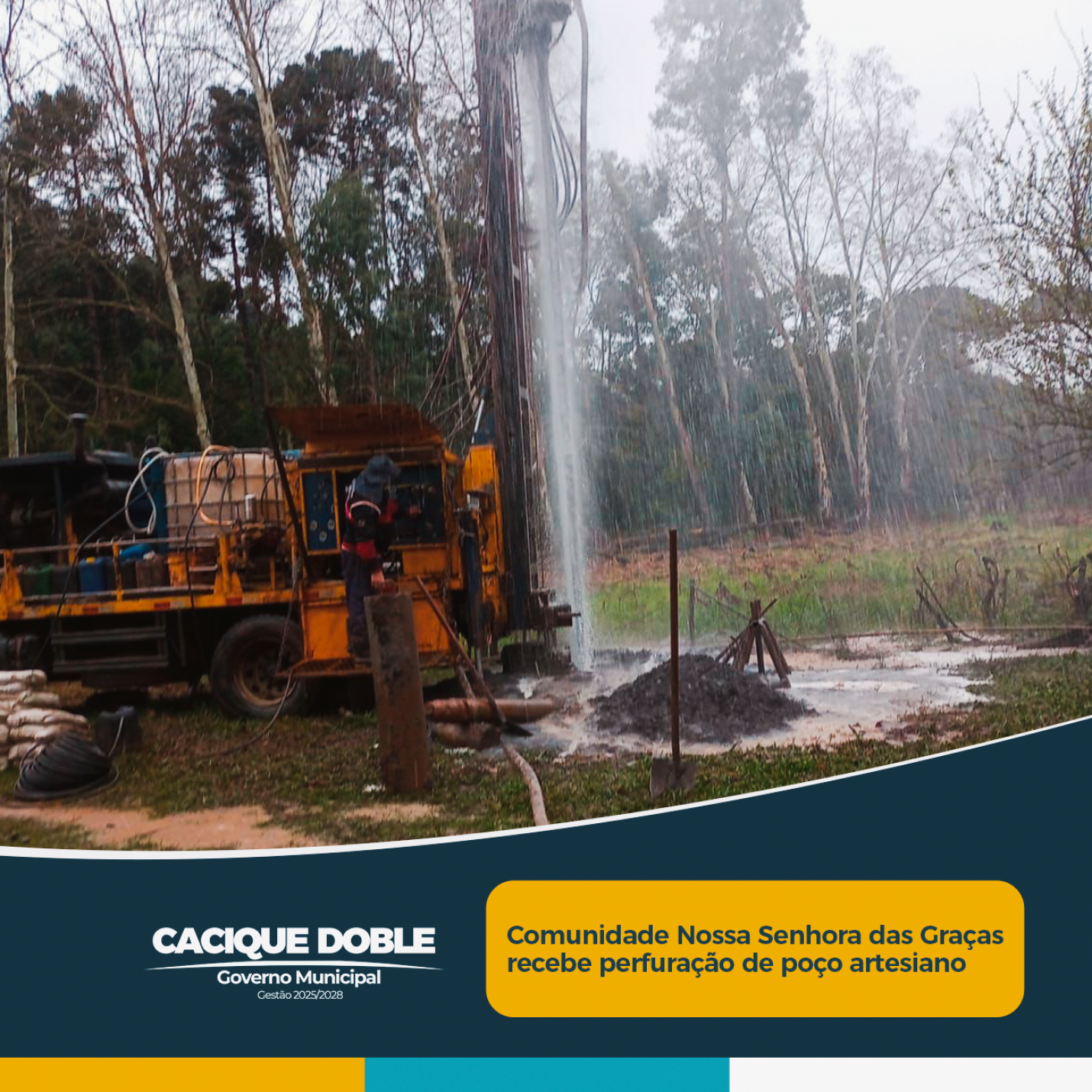 A comunidade Nossa Senhora das Graças já conta com um novo poço artesiano perfurado na propriedade de Gentil Bernardi, local indicado por estudo geológico como o mais adequado para a obra. A perfuração foi iniciada ainda na sexta-feira, dia 22 de agosto, acompanhada pelo prefeito Marcio Caprini e pela engenheira civil do município, Milena Olivotto e, nesta segunda-feira, dia 25 de agosto, já teve concluída a sua primeira fase.