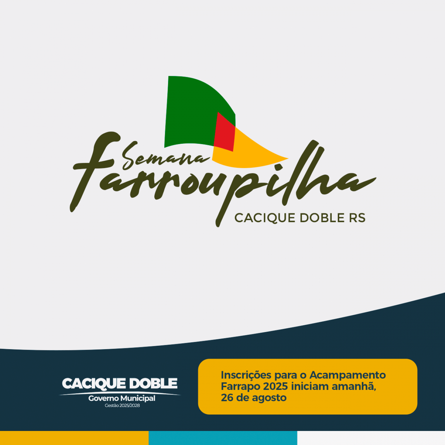 O Governo Municipal de Cacique Doble, por meio da Secretaria de Educação, Cultura, Desporto e Juventude, e a Comissão Organizadora da Semana Farroupilha e do Acampamento Farrapo informam que a partir desta terça-feira, 26 de agosto, iniciam as inscrições para o Acampamento Farrapo 2025. O prazo segue até o dia 29 de agosto, e os interessados devem realizar a reserva de lotes e a assinatura do termo de compromisso diretamente na Secretaria de Educação.
