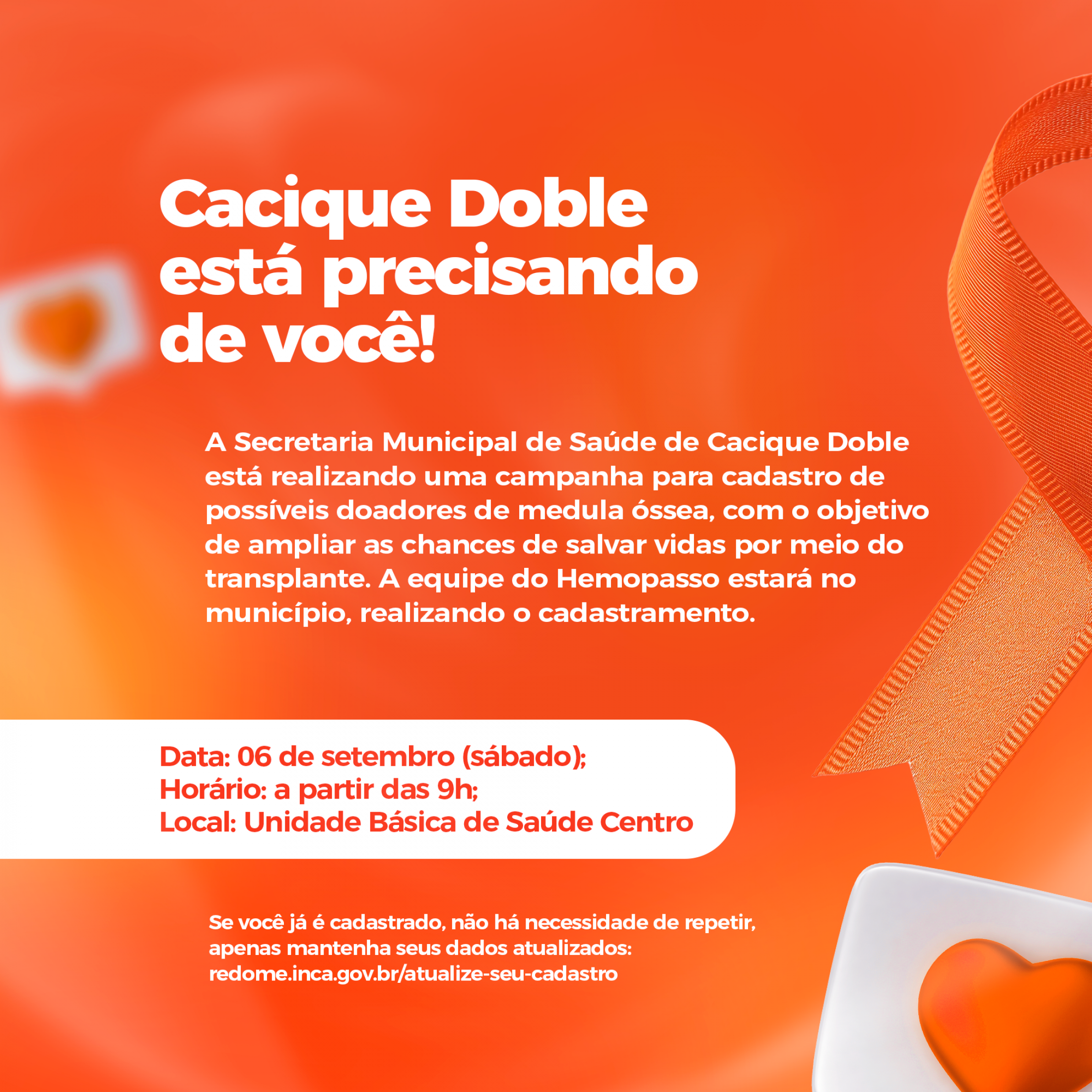 A Secretaria Municipal de Saúde de Cacique Doble está mobilizando a comunidade para uma ação especial e cheia de significado: o cadastro de possíveis doadores de medula óssea. No próximo sábado, dia 06 de setembro, a equipe do Hemopasso estará em nosso município para realizar o cadastramento. A ação acontecerá na Unidade Básica de Saúde Centro, a partir das 9h.