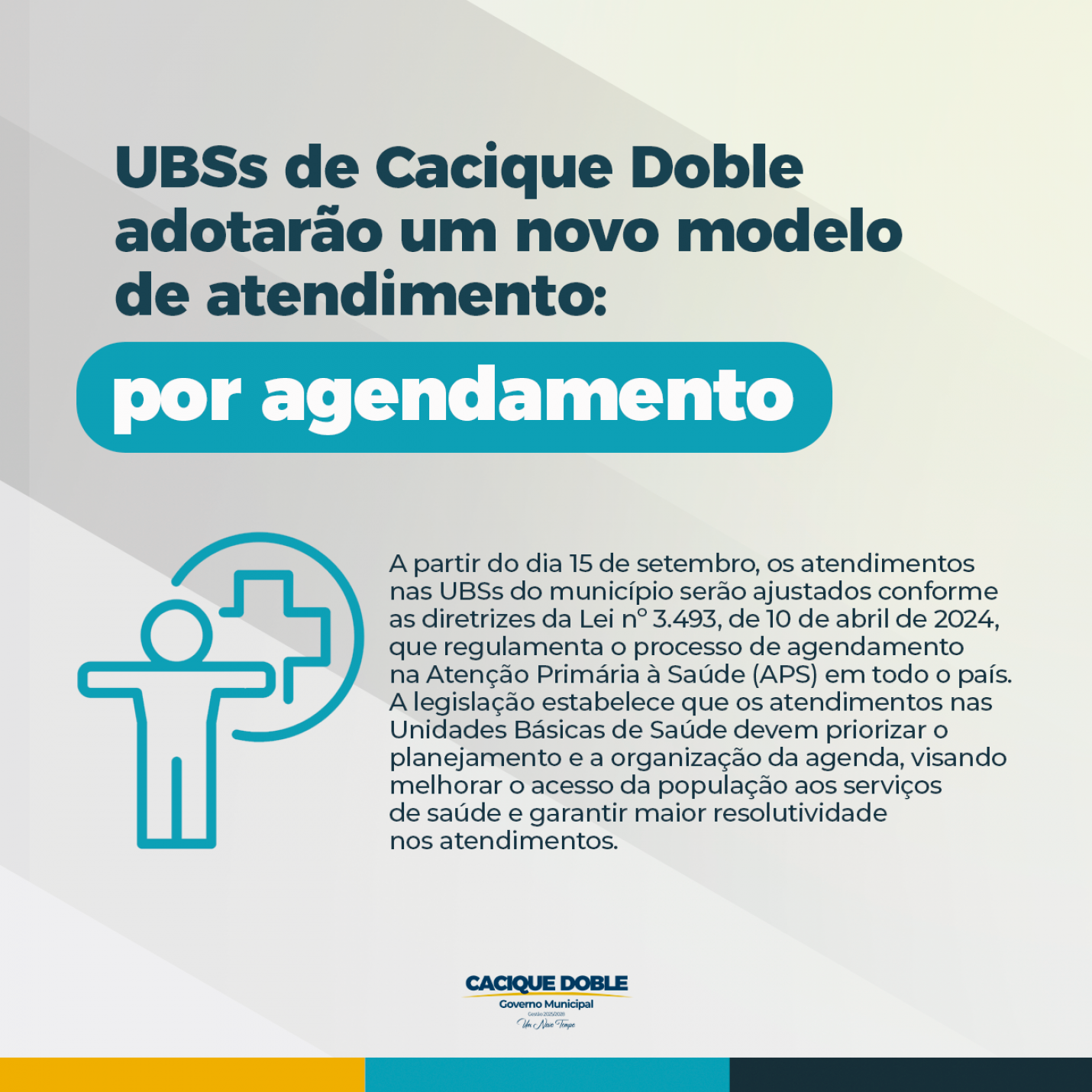 A partir do dia 15 de setembro, os atendimentos nas Unidades Básicas de Saúde (UBSs) de Cacique Doble passarão a seguir um novo modelo de agendamento, conforme a Lei nº 3.493, de 10 de abril de 2024, que regulamenta o processo de marcação de consultas na Atenção Primária à Saúde (APS) em todo o país.