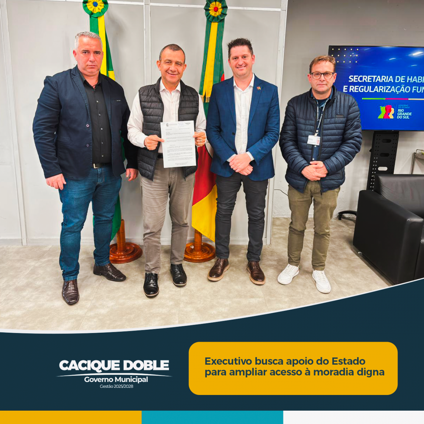 Cacique Doble deu o primeiro passo para viabilizar um projeto estruturado de melhoria habitacional, com foco especial nas famílias em situação de maior vulnerabilidade. Na manhã desta quinta-feira, 4 de setembro, o prefeito Marcio Caprini, esteve em Porto Alegre para uma importante agenda voltada à habitação. Acompanhado pelo secretário de Administração, Joceli Paim Zorzan, o gestor municipal foi recebido inicialmente pelo responsável pelo Departamento de Habitação, Jonatas Lopes, e, na sequência, pelo Secretário de Habitação e Regularização Fundiária do Estado do Rio Grande do Sul, Carlos Gomes.