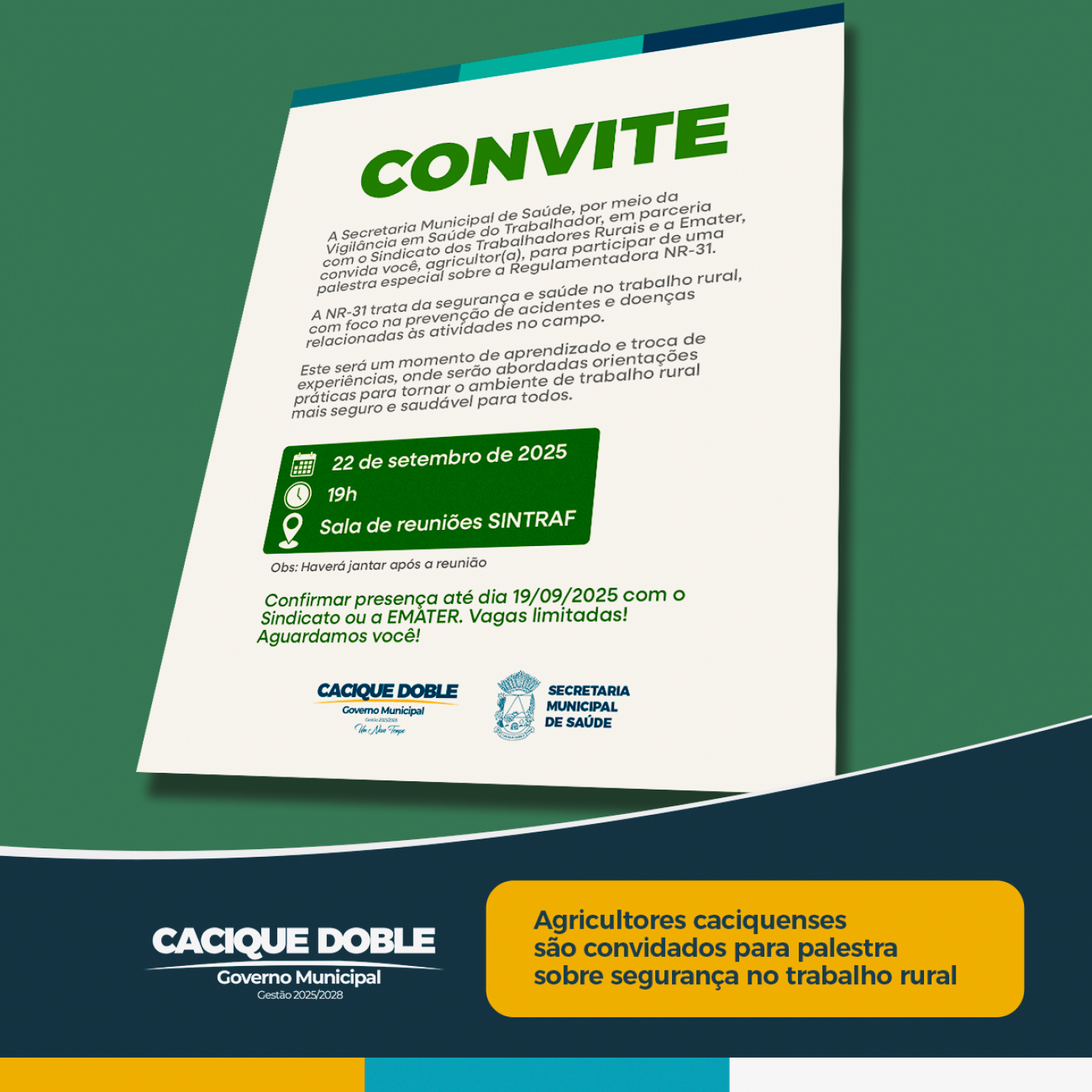 A Secretaria Municipal de Saúde, por meio da Vigilância em Saúde do Trabalhador, em parceria com o Sindicato dos Trabalhadores Rurais e a Emater, convida todos os agricultores do município para participarem de uma palestra especial sobre a Norma Regulamentadora NR-31, que trata da segurança e saúde no trabalho rural.