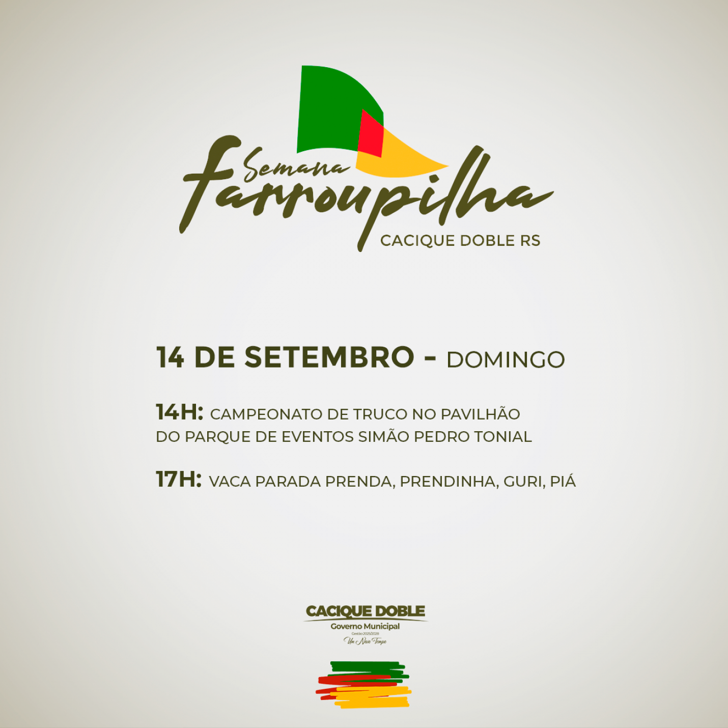 A Semana Farroupilha 2025 inicia neste sábado, dia 13 de setembro, com abertura oficial, almoço tradicionalista, cavalgada e início das atividades do Acampamento Farrapo. A programação repleta de tradição e integração segue no domingo, 14 de setembro, quando o Parque de Eventos Simão Pedro Tonial será palco de duas atividades especiais que prometem animar a comunidade.