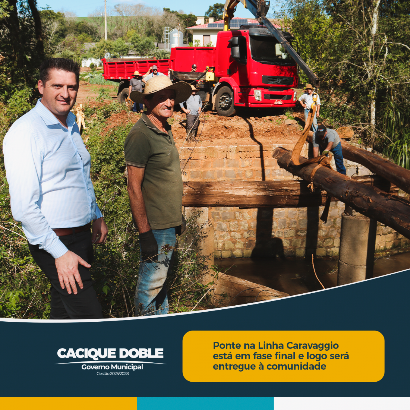 O Governo Municipal de Cacique Doble realizou nesta quarta-feira, 17 de setembro, uma vistoria na obra de recuperação de uma ponte do Rio Telheiro, na Linha Caravaggio, localizada nas proximidades das propriedades de Eurico de Mattos e Antônio Zucco. O prefeito Marcio Caprini acompanhou os trabalhos que são coordenados pelo vice-prefeito Alceu Demartini, reafirmando o compromisso da gestão com a segurança e a trafegabilidade da comunidade.