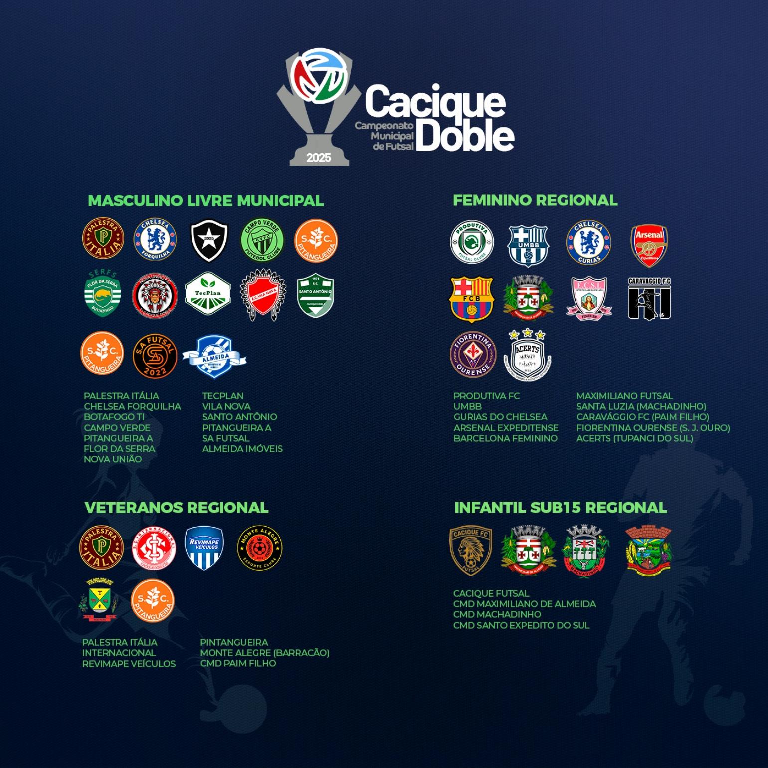 O Campeonato Municipal de Futsal 2025 de Cacique Doble deu um passo importante nesta quinta-feira, 18 de setembro, com a realização do sorteio das chaves. A competição promete movimentar o esporte local e regional, com 33 equipes inscritas, distribuídas em quatro categorias: Masculino Livre, Veteranos, Feminino Regional e Infantil Sub-15.