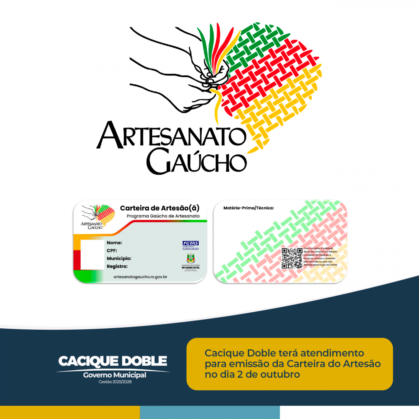 Na próxima quinta-feira, dia 2 de outubro, Cacique Doble terá uma importante oportunidade para os artesãos locais: a emissão da Carteira Estadual ou Nacional de Artesão(ã). O atendimento acontece no turno da manhã, na Câmara Municipal de Vereadores, e será conduzido pela equipe do Sine/FGTAS.