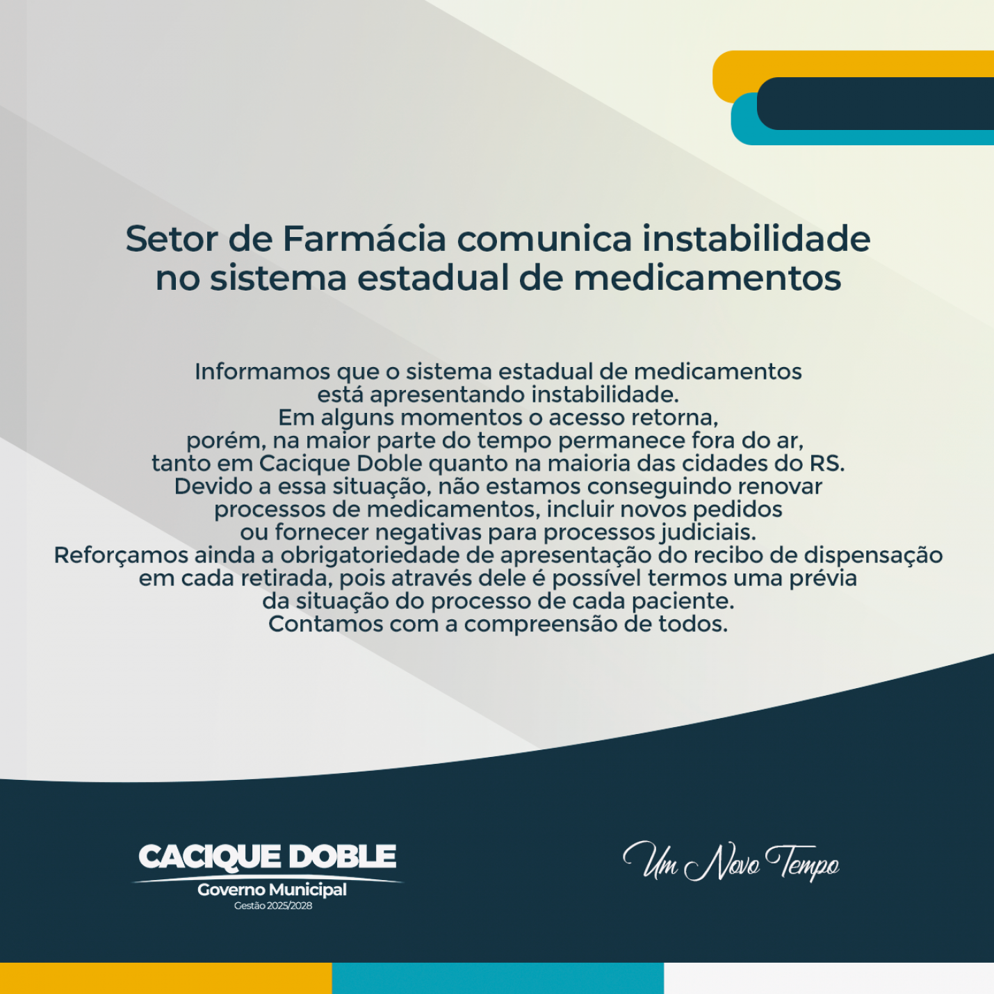 A Secretaria Municipal de Saúde de Cacique Doble, por meio do setor de Farmácia, informa que o sistema estadual de medicamentos está apresentando instabilidade. Em alguns momentos o acesso é restabelecido, mas, na maior parte do tempo, permanece fora do ar, situação que afeta não apenas o município, mas também diversas cidades do Rio Grande do Sul.