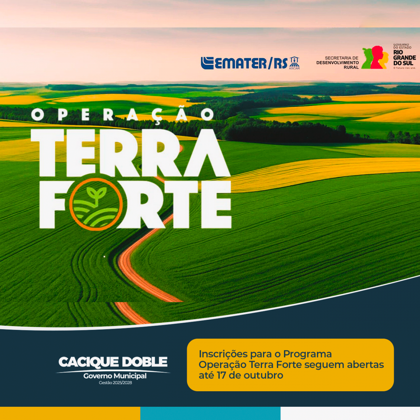 Seguem abertas até o dia 17 de outubro as inscrições para o Programa Operação Terra Forte, iniciativa voltada à recuperação socioprodutiva e ambiental de propriedades atingidas pelos eventos climáticos do ano passado. Em Cacique Doble, serão 45 famílias selecionadas, além de 9 suplentes, totalizando R$ 1,35 milhão em investimentos, além de um trator avaliado em R$ 550 mil, fortalecendo a estrutura do setor agrícola local.