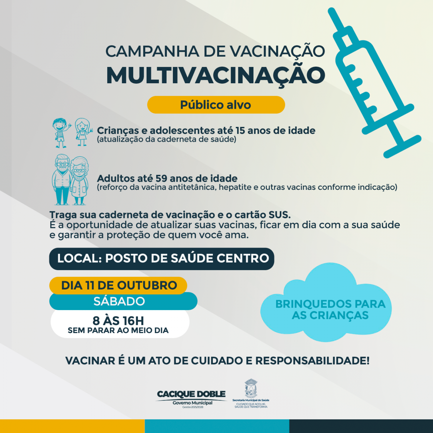 A Secretaria Municipal de Saúde de Cacique Doble convida toda a população para participar da Campanha de Multivacinação, que será realizada neste sábado, dia 11 de outubro, na Unidade Básica de Saúde do Centro, das 8h às 16h, sem intervalo ao meio-dia.