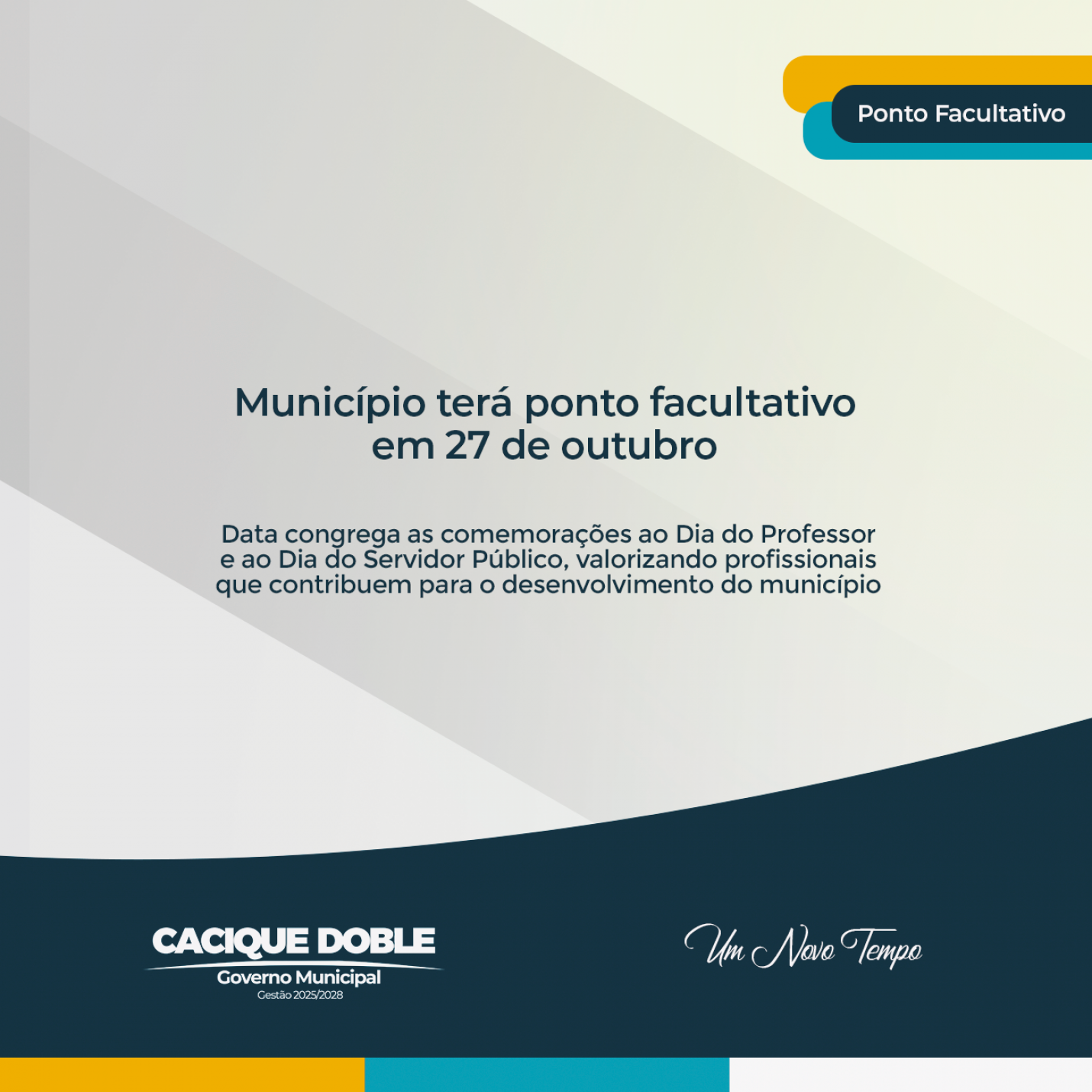 O município de Cacique Doble terá ponto facultativo no dia 27 de outubro, segunda-feira, no âmbito do Poder Executivo Municipal. A medida foi publicada no Decreto nº 1.085/2025, de 07 de outubro, que estabelece que não haverá atendimento ao público nesta data.