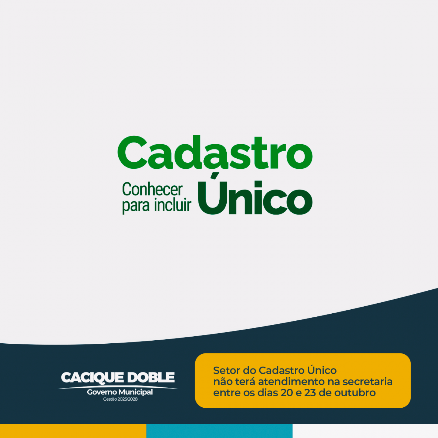 A Secretaria Municipal de Assistência Social de Cacique Doble informa que o setor do Cadastro Único estará fechado para atendimento ao público na secretaria entre os dias 20 e 23 de outubro, retomando suas atividades normalmente na sexta-feira, dia 24, na sede da secretaria.