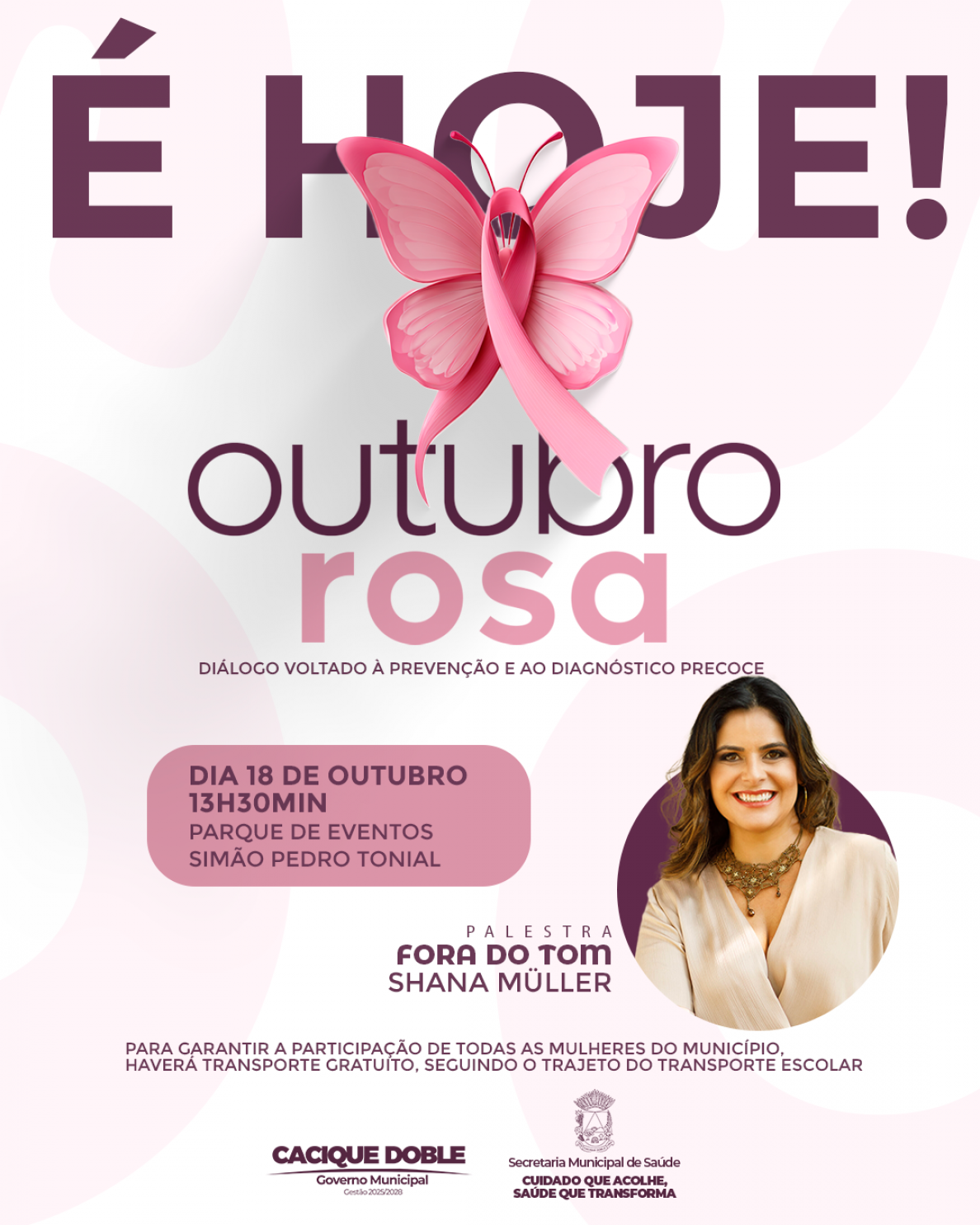 Neste sábado, 18 de outubro, Cacique Doble viverá um dos momentos mais aguardados da programação do Outubro Rosa 2025, com uma tarde repleta de emoção, informação e inspiração voltada à valorização da saúde da mulher. O encontro especial, promovido pela Secretaria Municipal de Saúde, acontece a partir das 13h30min, no Parque de Eventos Simão Pedro Tonial, e contará com a palestra “Fora do Tom”, ministrada pela jornalista, cantora e apresentadora Shana Müller.