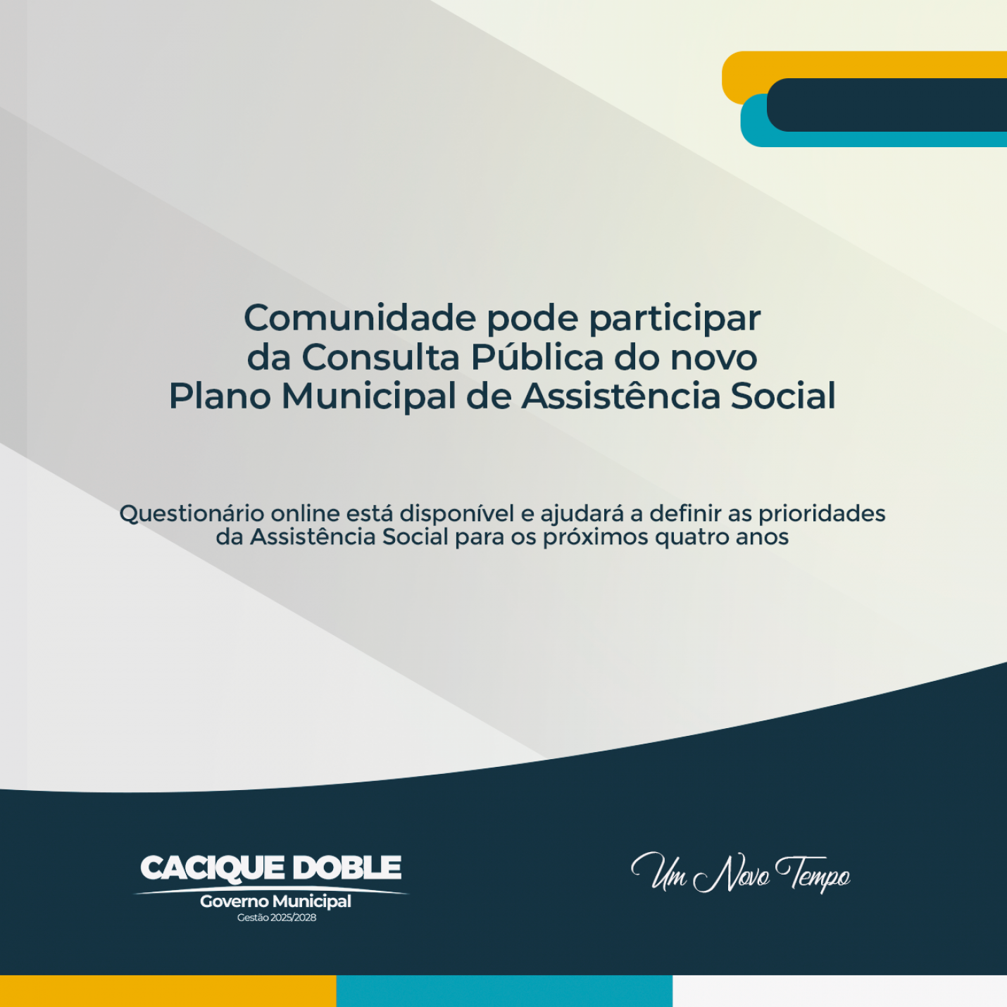 O Governo Municipal de Cacique Doble, por meio da Secretaria de Assistência Social, convida toda a comunidade a participar da Consulta Pública para o Plano Municipal de Assistência Social 2026–2029. A participação é simples e pode ser feita de forma online, por meio do Questionário de Consulta à População – PMAS, disponível até o final de outubro.