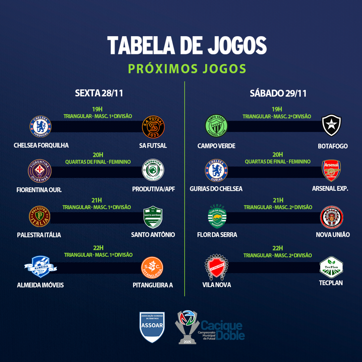 A rodada de sábado,29 de novembro, abre às 19h com o confronto da 2ª Divisão Masculina entre Campo Verde e Botafogo. Às 20h, acontecem mais Quartas de Final no Feminino: Gurias do Chelsea x Arsenal Expediense. Às 21h, pelo Triangular da 2ª Divisão, entram em quadra Flor da Serra e Nova União. Encerrando a programação, às 22h, Vila Nova enfrenta Tecplan, pela mesma categoria.