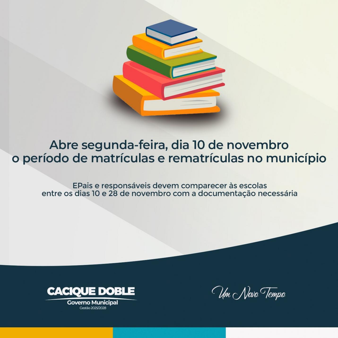 O Governo Municipal de Cacique Doble, por meio da Secretaria Municipal de Educação, lembra que esta sexta-feira, dia 28 de novembro, é o último dia para pais e responsáveis realizarem matrículas e rematrículas para o ano letivo de 2026 na Rede Municipal de Ensino. Todas as inscrições estão sendo feitas diretamente nas escolas, e é indispensável apresentar a documentação necessária para garantir a vaga do estudante.