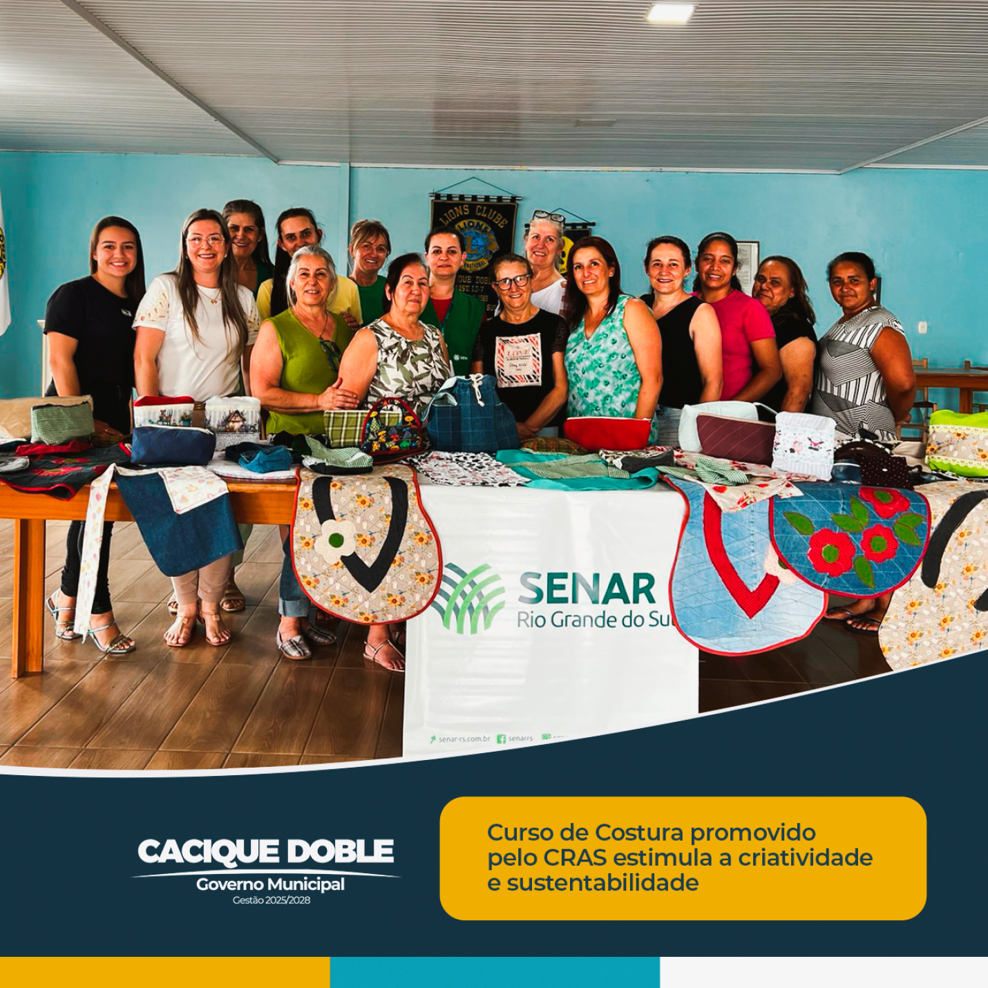 Encerrou nesta sexta-feira, dia 28 de novembro, o curso gratuito “Introdução à Costura e Transformação de Peças do Vestuário”, promovido pela Secretaria Municipal de Assistência Social e pelo CRAS de Cacique Doble, em parceria com o Senar e o Sindicato dos Empregadores Rurais de São José do Ouro. A capacitação foi realizada na sede do Lions Clube e contou com 32 horas de atividades práticas e formativas ao longo de quatro dias.