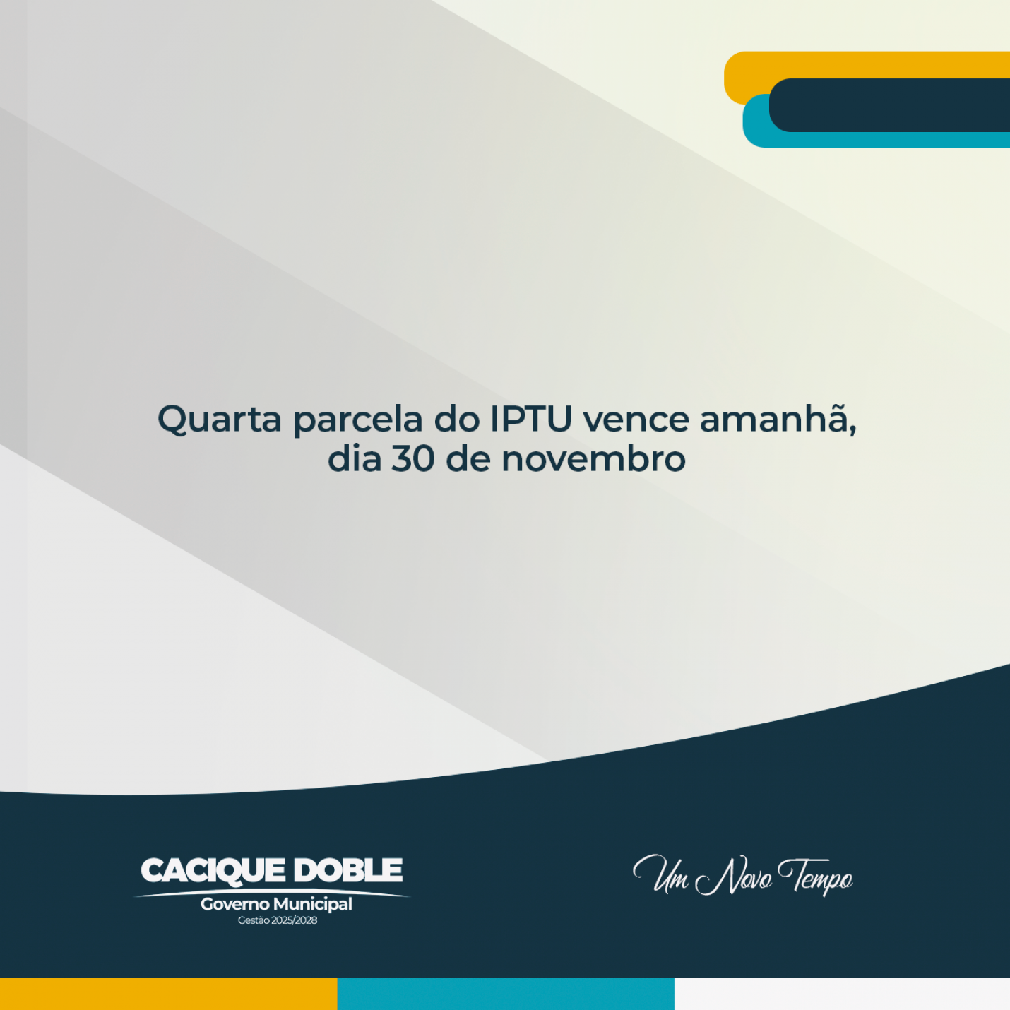 O Governo Municipal de Cacique Doble, por meio do Setor de Tributos, informa que vence neste domingo, dia 30 de novembro, o prazo para pagamento da quarta e última parcela do Imposto Predial e Territorial Urbano (IPTU) de 2025. O pagamento é feito pelos contribuintes que optaram pelo parcelamento em até quatro vezes. As parcelas anteriores venceram nos dias 30 de agosto, 30 de setembro e 30 de outubro