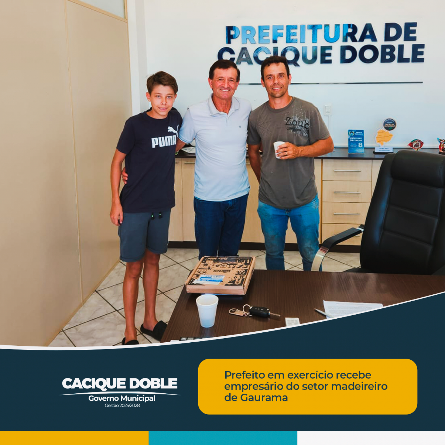 Na manhã desta quinta-feira, dia 12 de fevereiro, o prefeito em exercício de Cacique Doble, Alceu Demartini, recebeu em seu gabinete a visita do empresário Vinicios Volpi, do município de Gaurama, que atua no setor de madeiras oriundas de reflorestamentos de eucalipto e pinos.