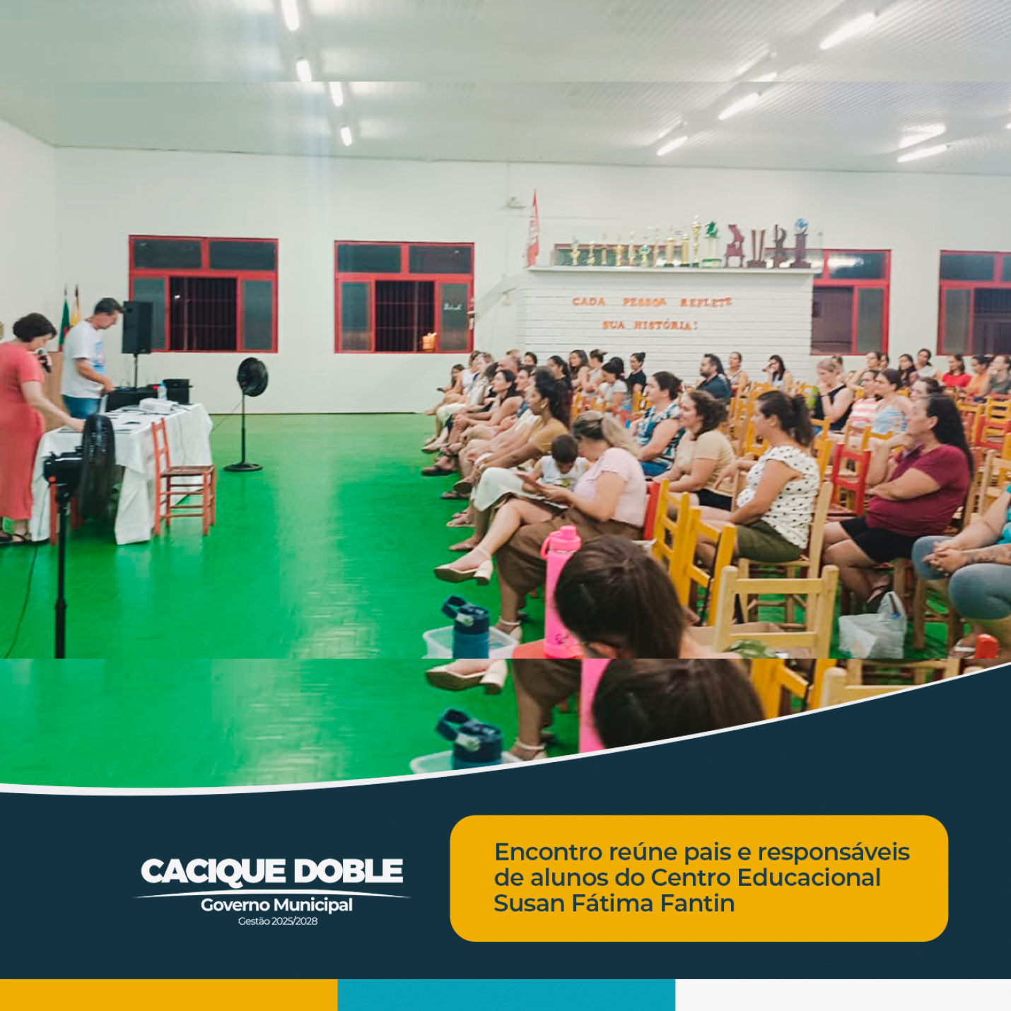 A Secretaria Municipal de Educação de Cacique Doble realizou, na noite desta quinta-feira, dia 12 de fevereiro, um encontro com pais e responsáveis dos estudantes matriculados no Centro Municipal Educacional Susan Fátima Fantin. A atividade aconteceu no Sport Club Internacional e integrou o calendário de ações voltadas ao fortalecimento da parceria entre escola e família.